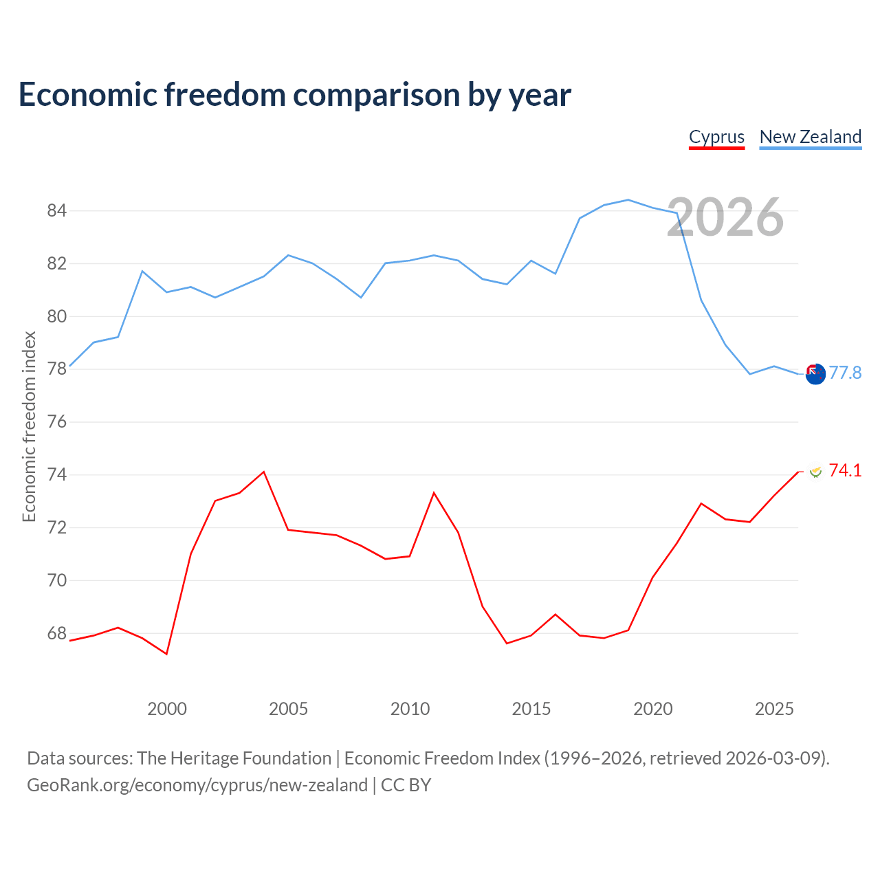 The Economic Freedom Index for Cyprus is 74.1, ranking 21/197, compared to 77.8 for New Zealand, ranking 13/197. The chart above displays a comparison of annual changes in economic freedom indexes.