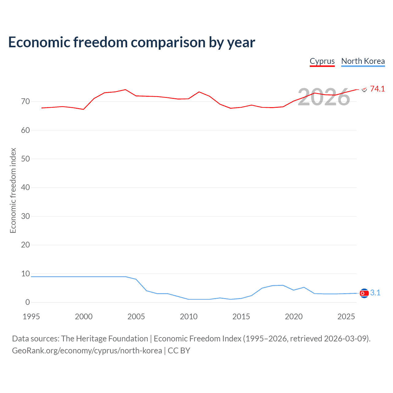 The Economic Freedom Index for Cyprus is 74.1, ranking 21/197, compared to 3.1 for North Korea, ranking 197/197. The chart above displays a comparison of annual changes in economic freedom indexes.