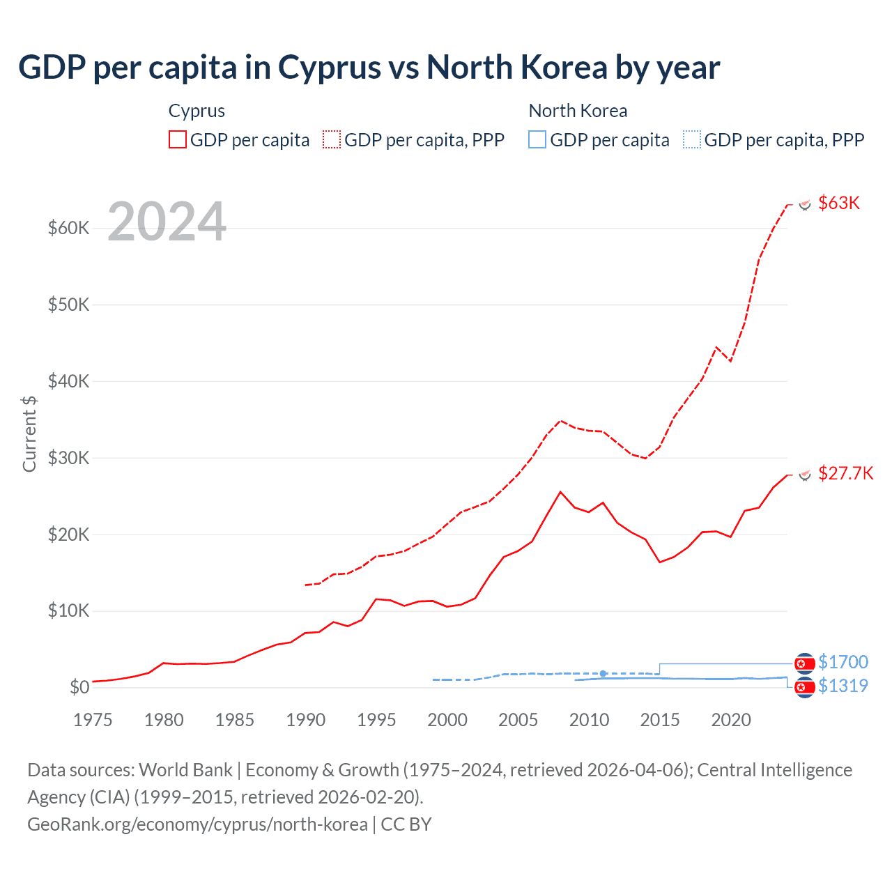 GDP per capita in Cyprus vs North Korea by year