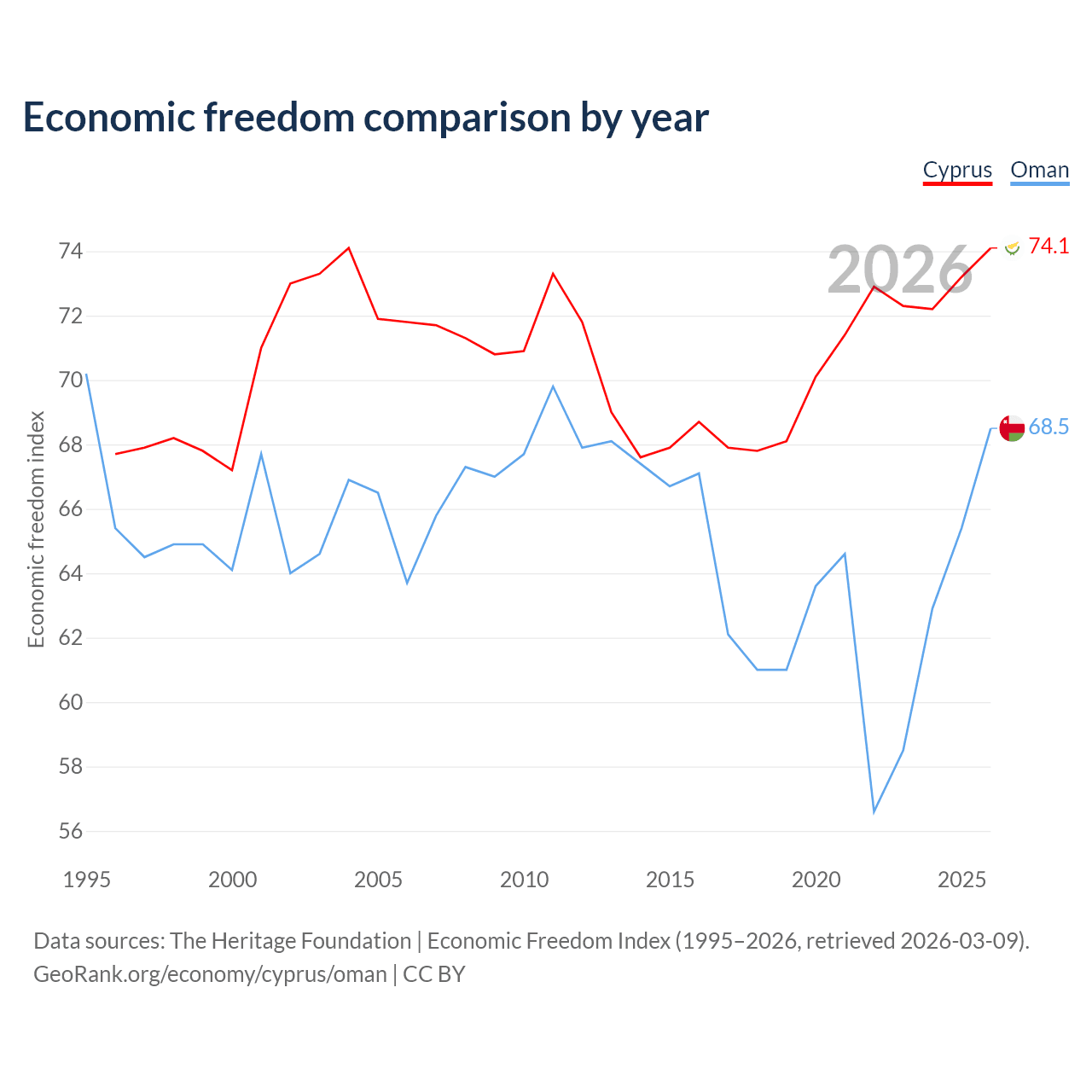 The Economic Freedom Index for Cyprus is 74.1, ranking 21/197, compared to 68.5 for Oman, ranking 45/197. The chart above displays a comparison of annual changes in economic freedom indexes.