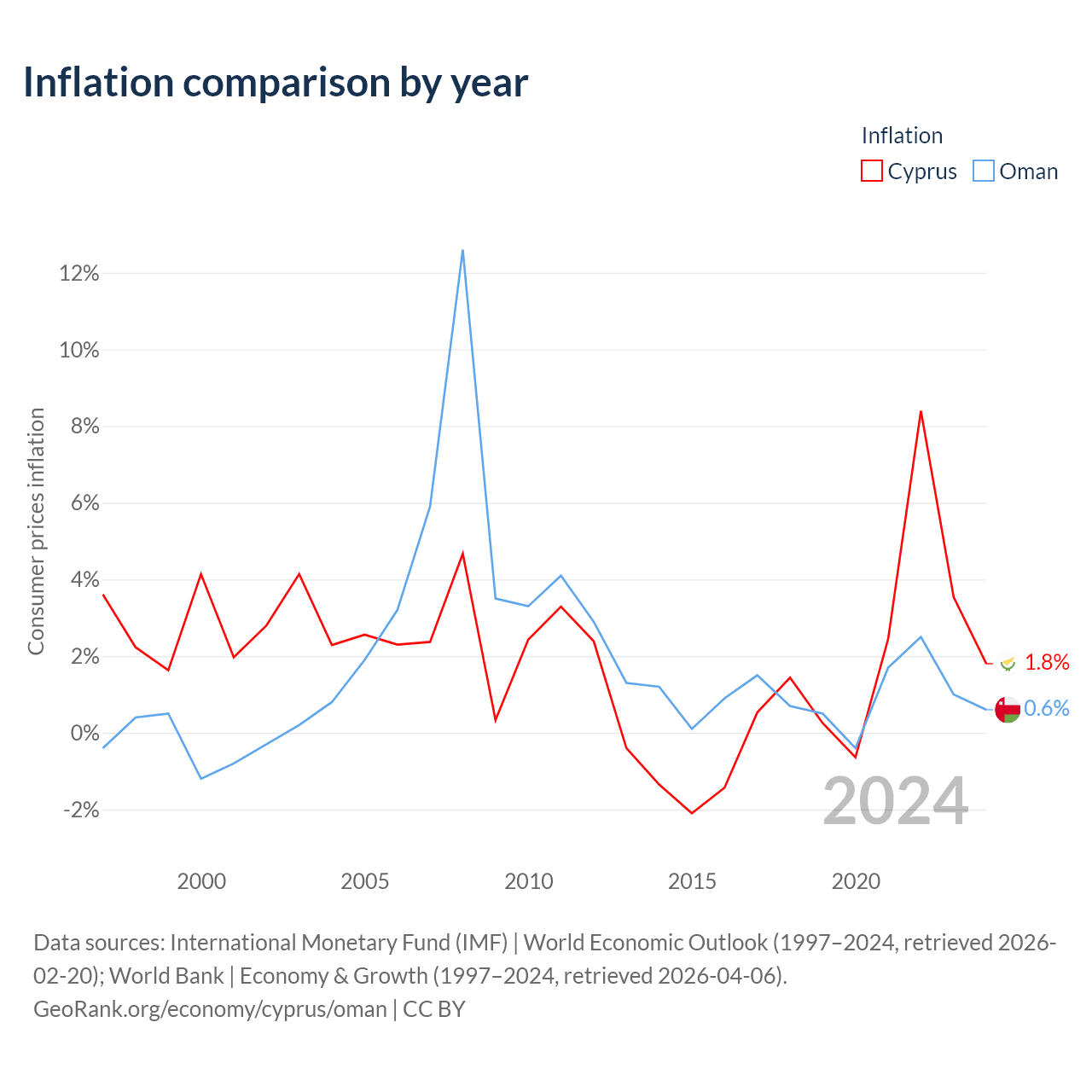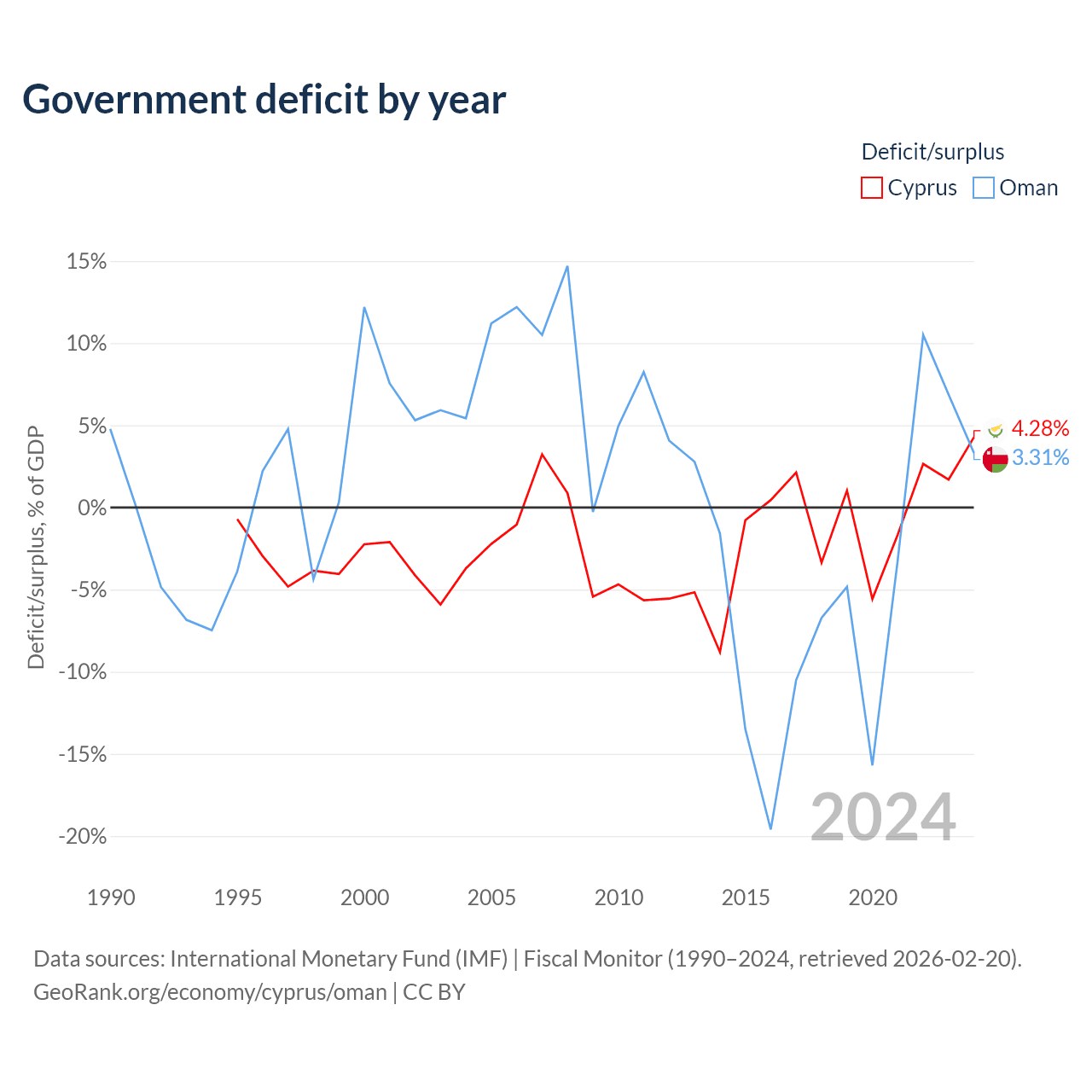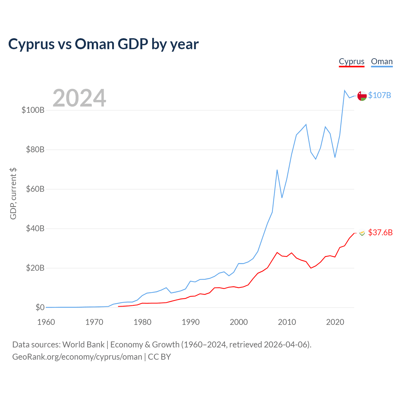 Cyprus has a GDP of $37.6B compared to $107B for Oman, ranking 103/197 and 70/197 by economy size, respectively.