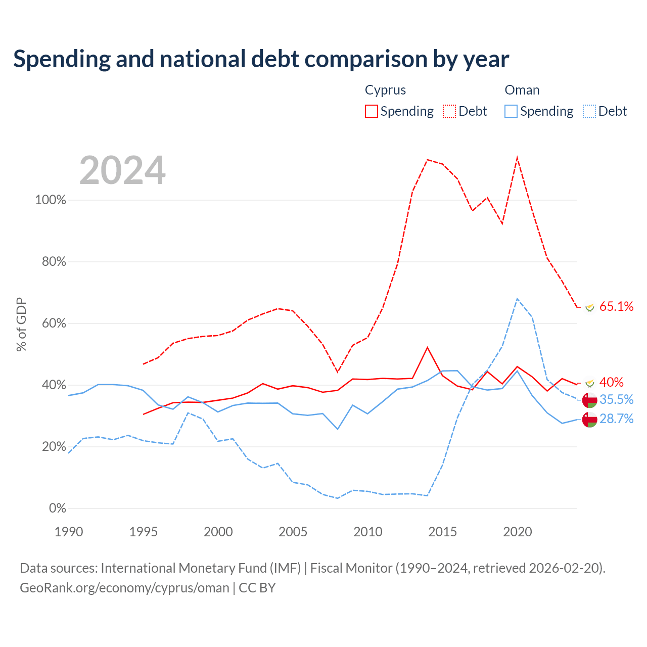 Cyprus has $24.5B in government debt (65.1% of GDP), compared to $38B (35.5% of GDP) in Oman.