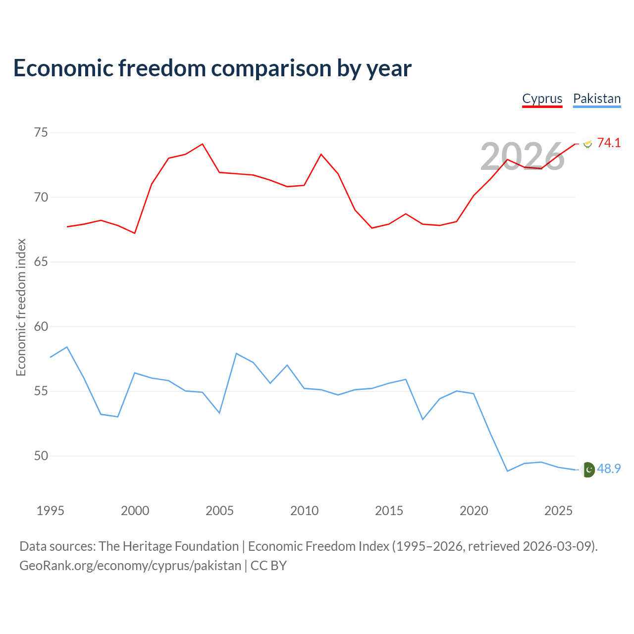 The Economic Freedom Index for Cyprus is 74.1, ranking 21/197, compared to 48.9 for Pakistan, ranking 168/197. The chart above displays a comparison of annual changes in economic freedom indexes.