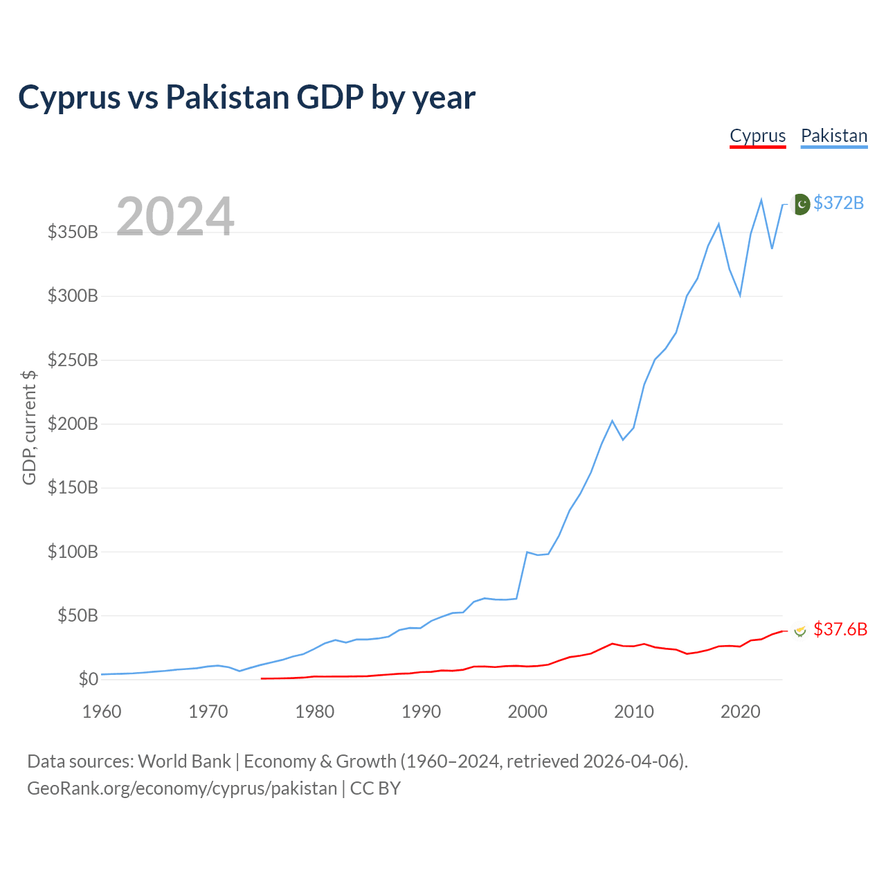 Cyprus has a GDP of $37.6B compared to $372B for Pakistan, ranking 103/197 and 43/197 by economy size, respectively.