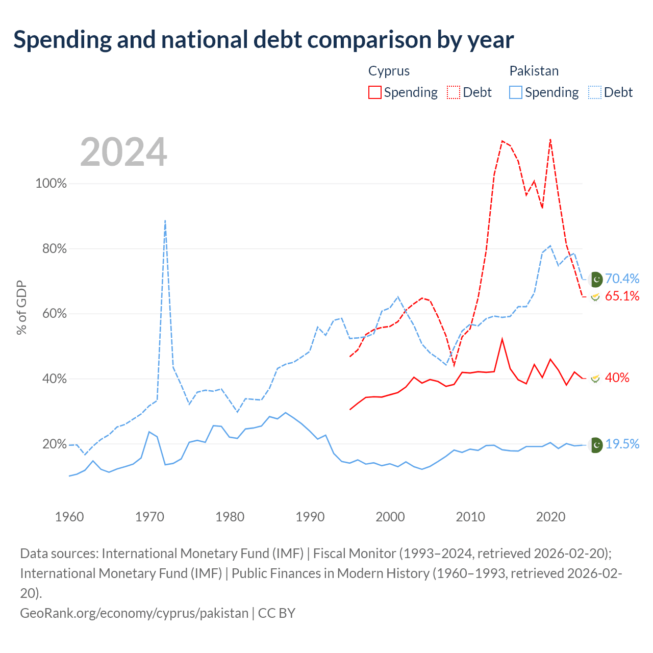 Cyprus has $24.5B in government debt (65.1% of GDP), compared to $262B (70.4% of GDP) in Pakistan.