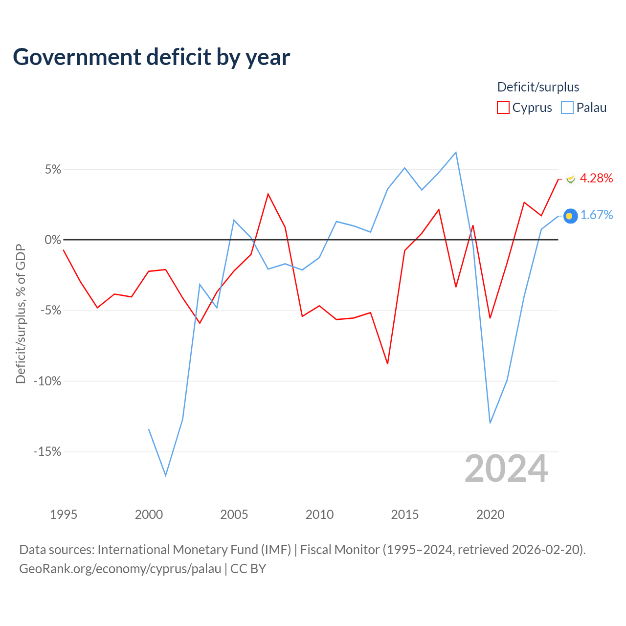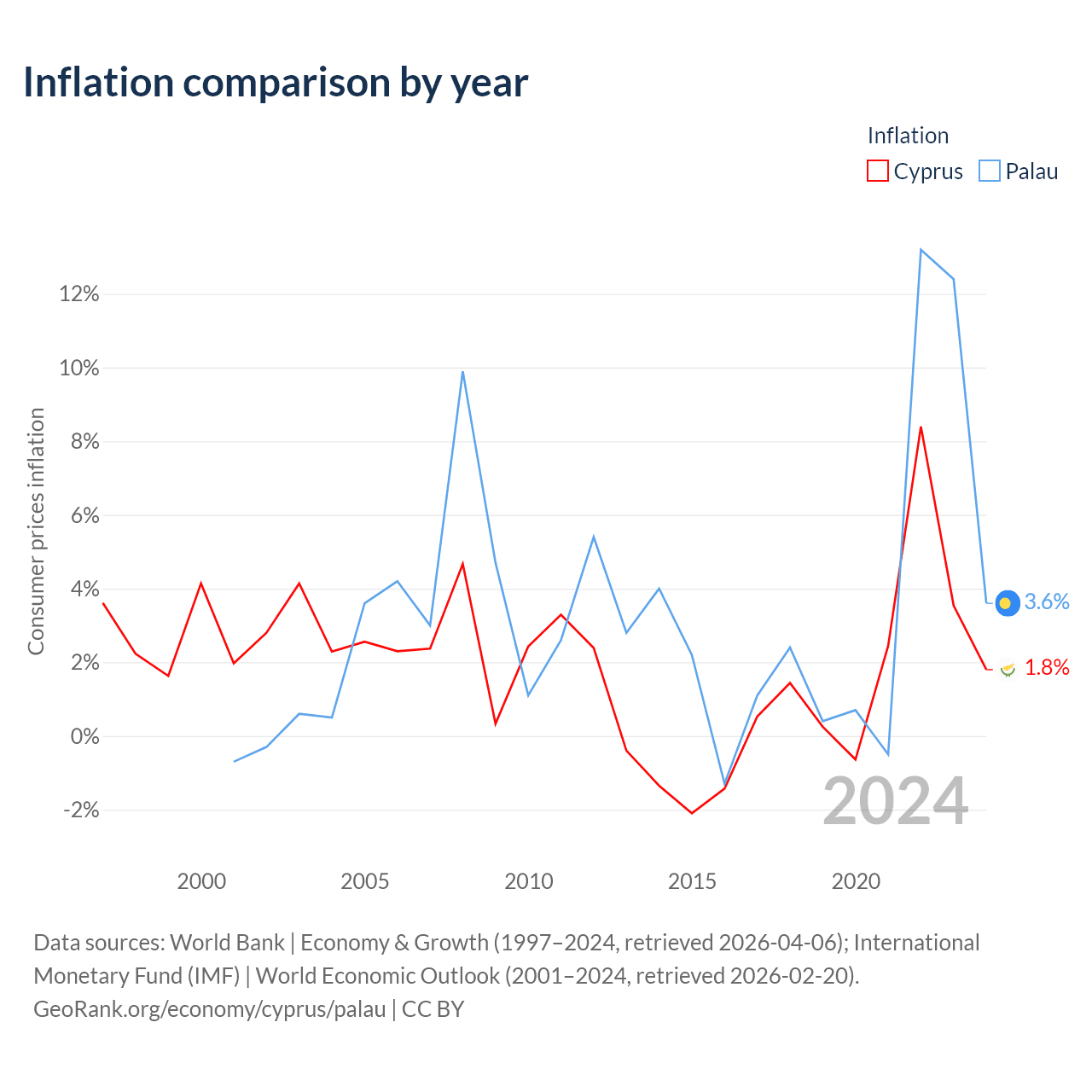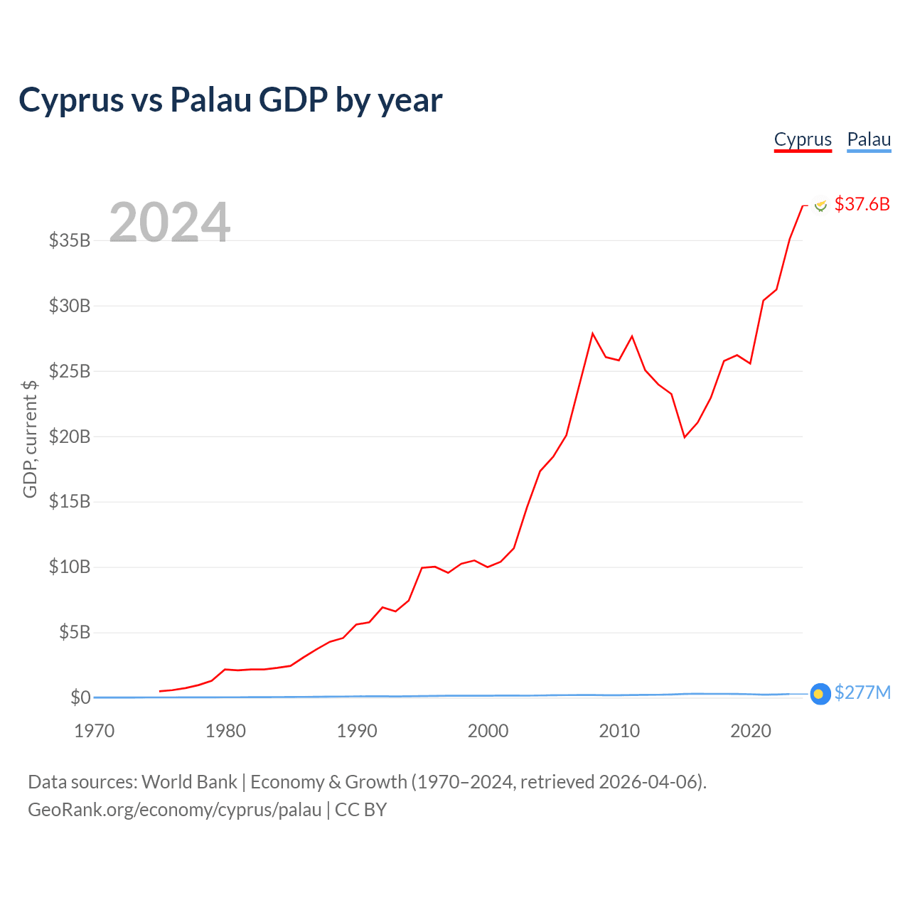 Cyprus has a GDP of $37.6B compared to $277M for Palau, ranking 103/197 and 194/197 by economy size, respectively.