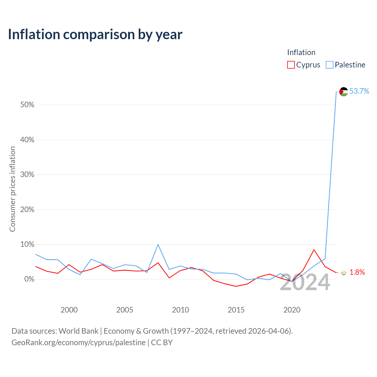 Cyprus has a GDP of $37.6B compared to $13.7B for Palestine, ranking 103/197 and 146/197 by economy size, respectively.