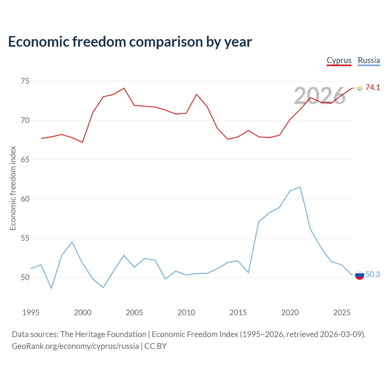 The Economic Freedom Index for Cyprus is 74.1, ranking 21/197, compared to 50.3 for Russia, ranking 161/197. The chart above displays a comparison of annual changes in economic freedom indexes.