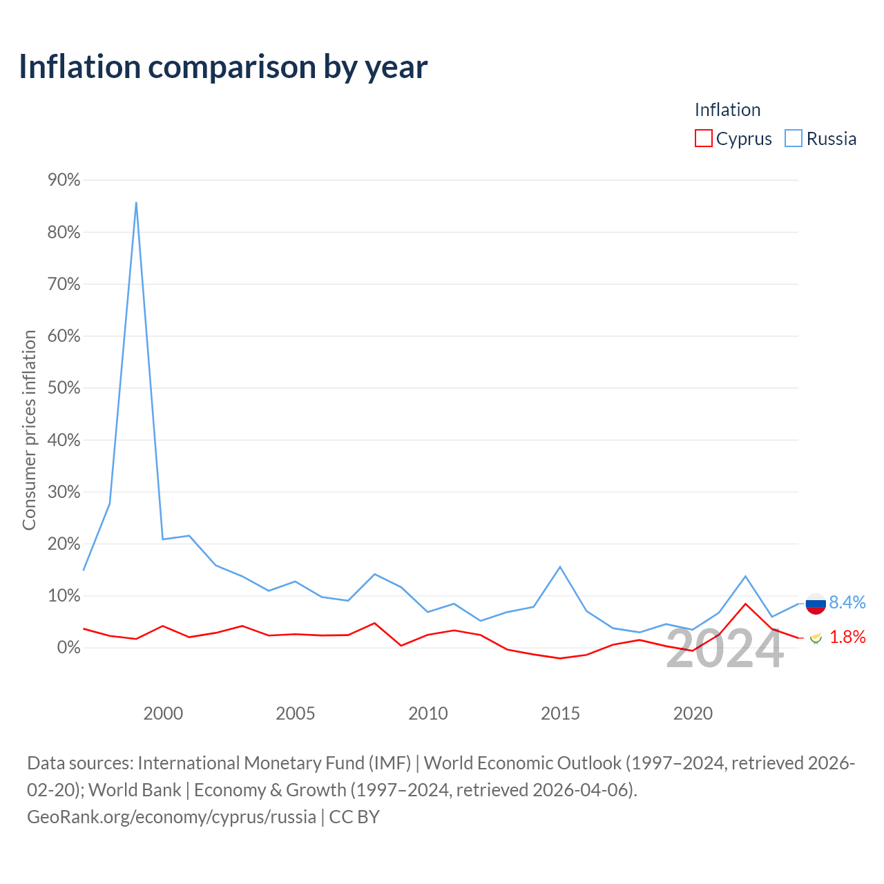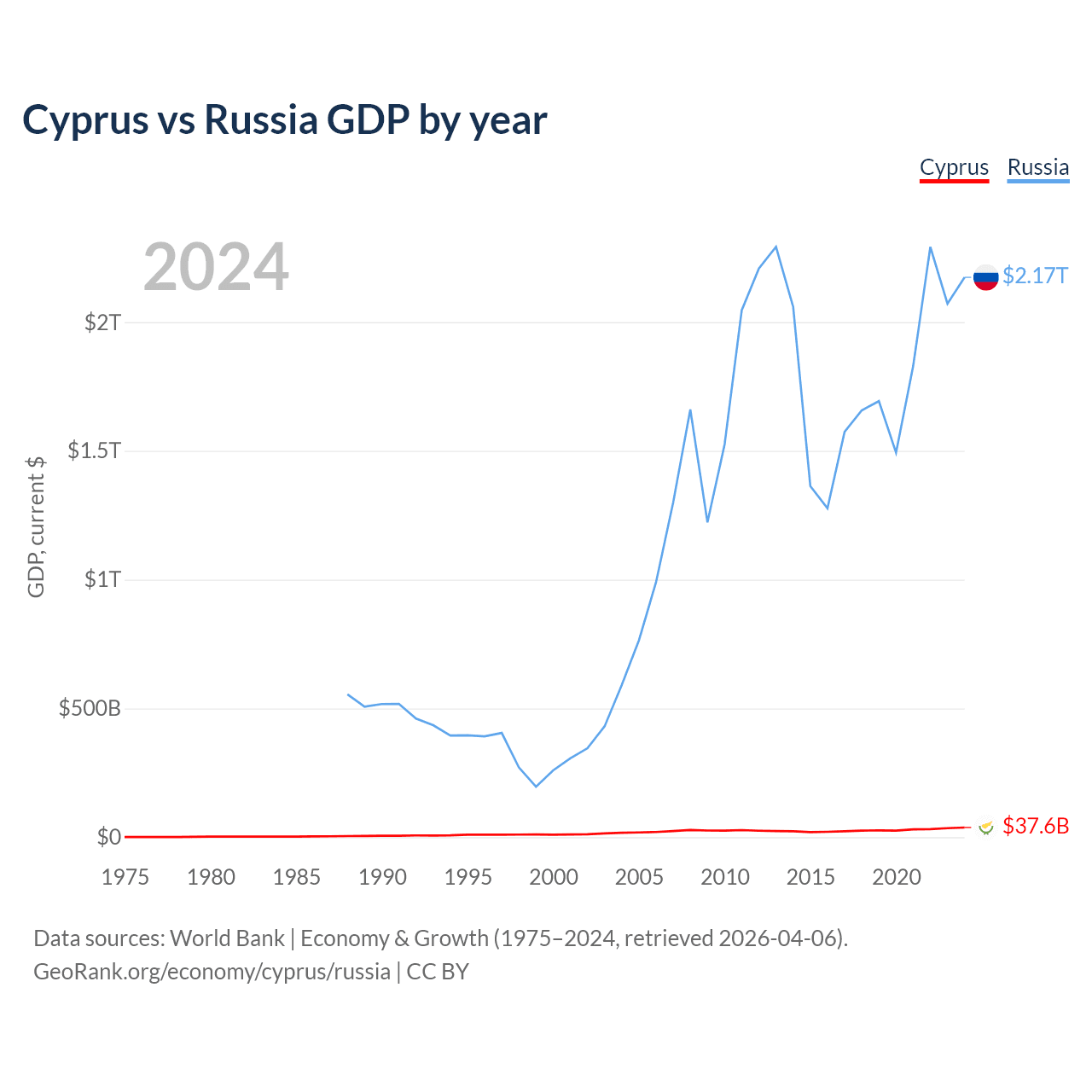 Cyprus has a GDP of $37.6B compared to $2.17T for Russia, ranking 103/197 and 11/197 by economy size, respectively.