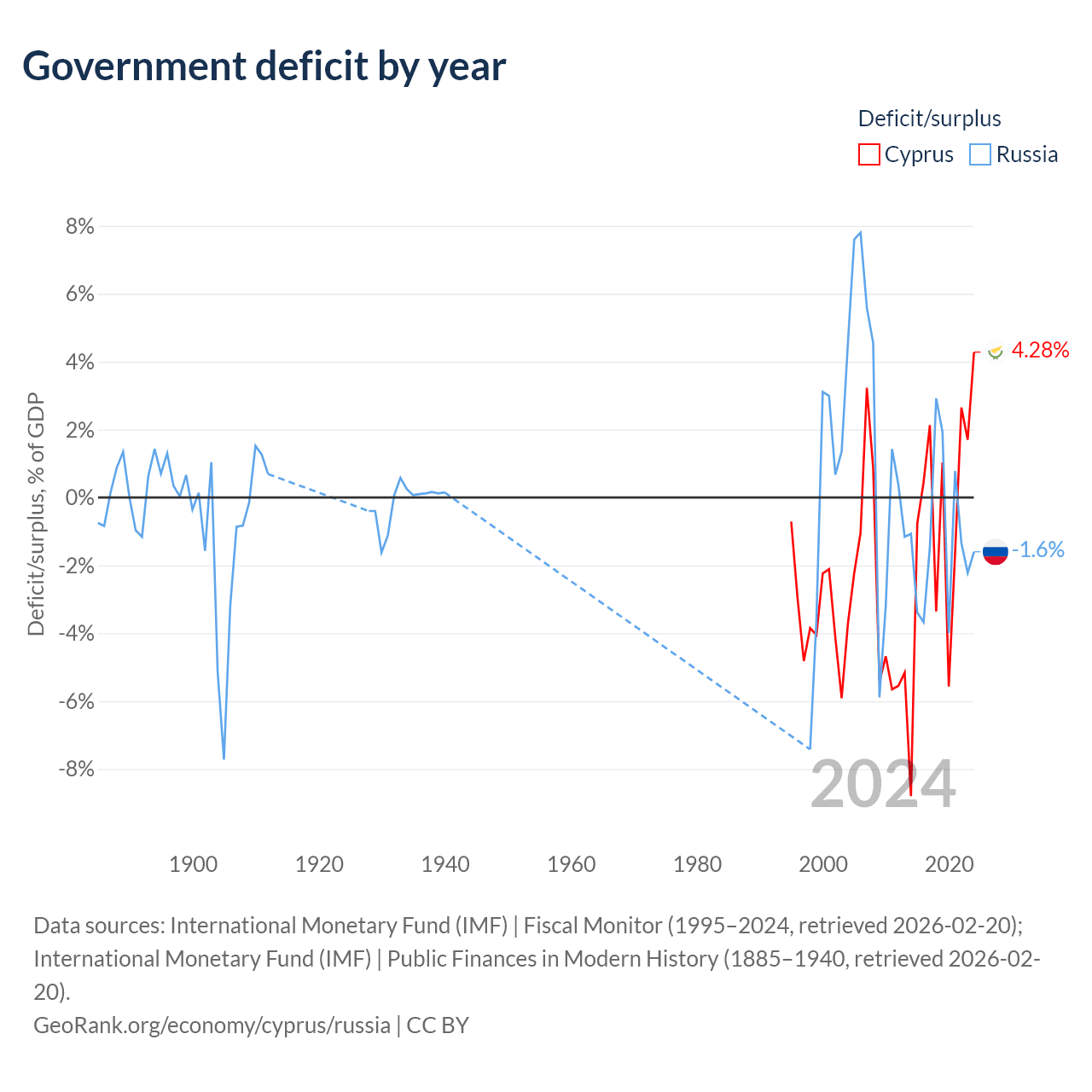 Cyprus has $24.5B in government debt (65.1% of GDP), compared to $440B (20.3% of GDP) in Russia.