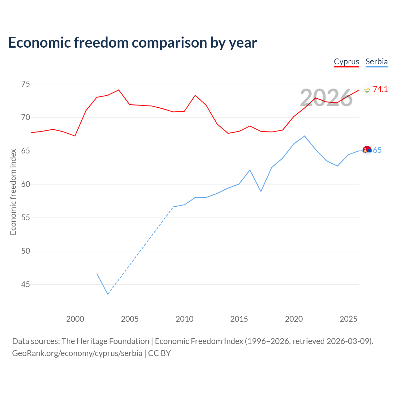 The Economic Freedom Index for Cyprus is 74.1, ranking 21/197, compared to 65 for Serbia, ranking 68/197. The chart above displays a comparison of annual changes in economic freedom indexes.