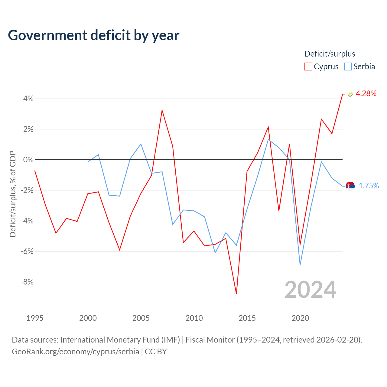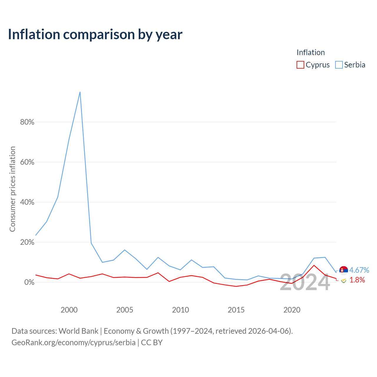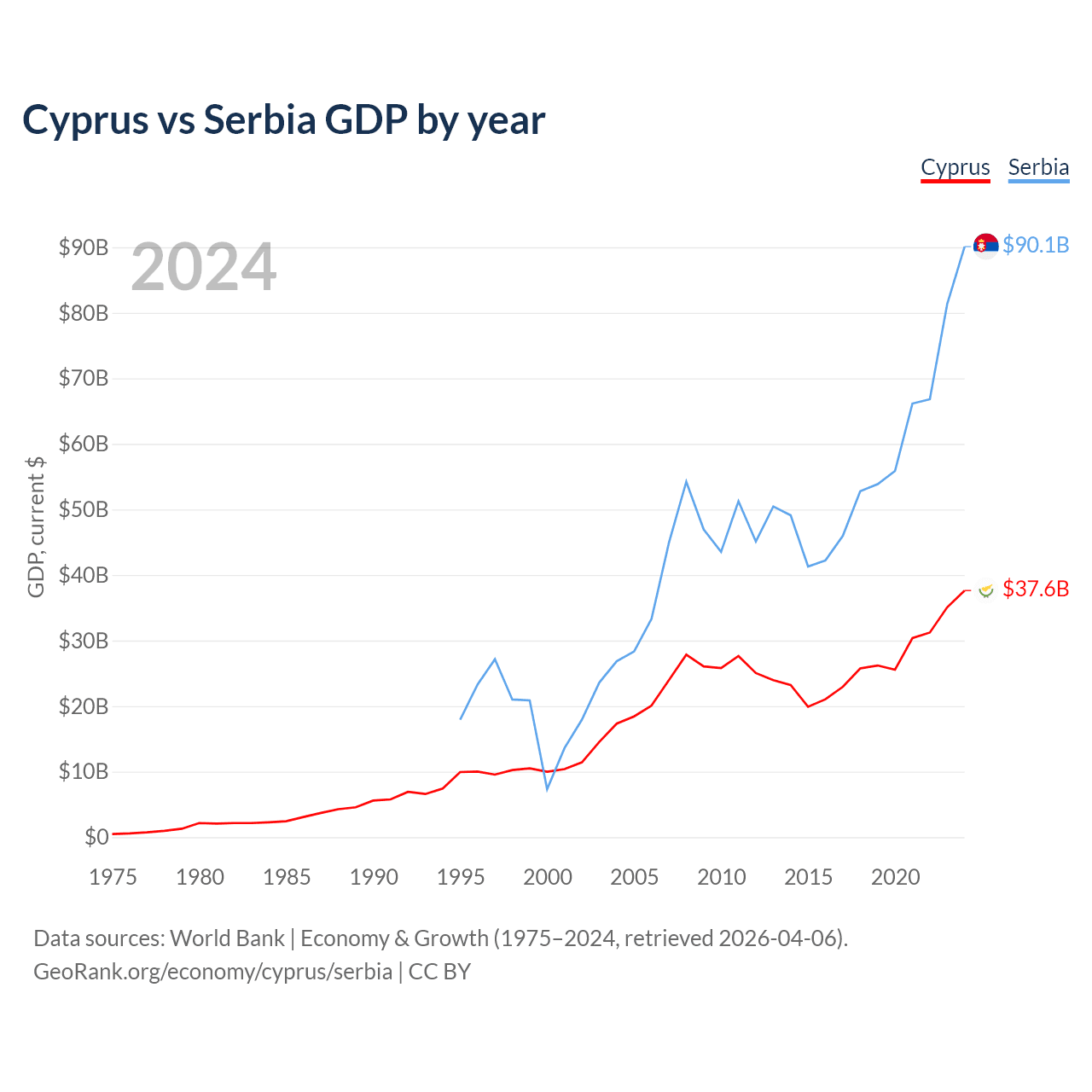 Cyprus has a GDP of $37.6B compared to $90.1B for Serbia, ranking 103/197 and 76/197 by economy size, respectively.