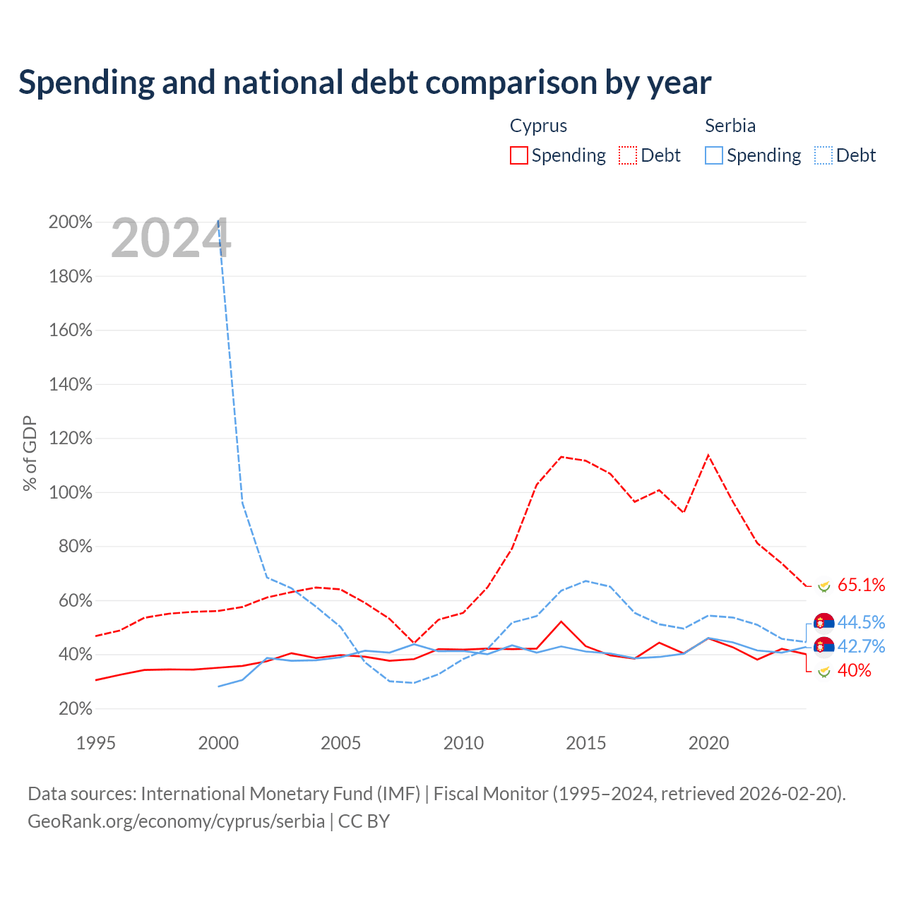 Cyprus has $24.5B in government debt (65.1% of GDP), compared to $40.1B (44.5% of GDP) in Serbia.
