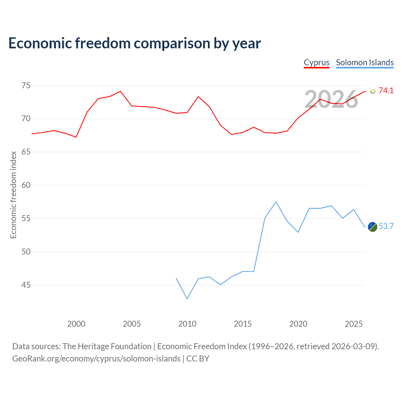 The Economic Freedom Index for Cyprus is 74.1, ranking 21/197, compared to 53.7 for the Solomon Islands, ranking 137/197. The chart above displays a comparison of annual changes in economic freedom indexes.