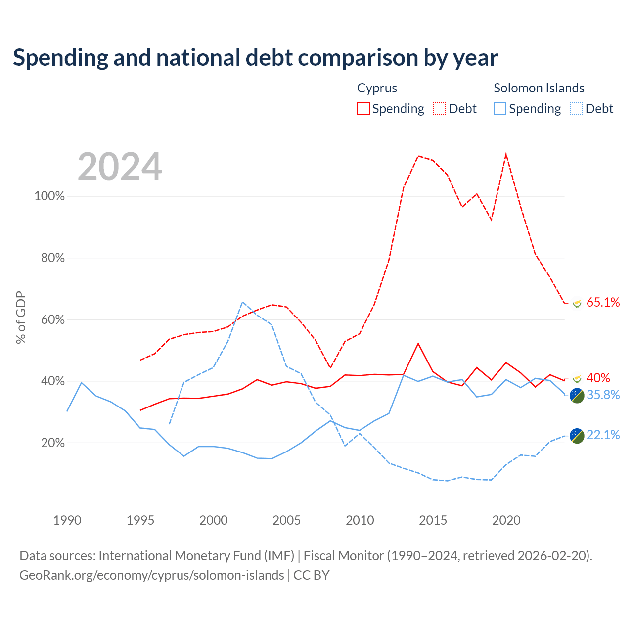 Cyprus has $24.5B in government debt (65.1% of GDP), compared to $350M (22.1% of GDP) in the Solomon Islands.
