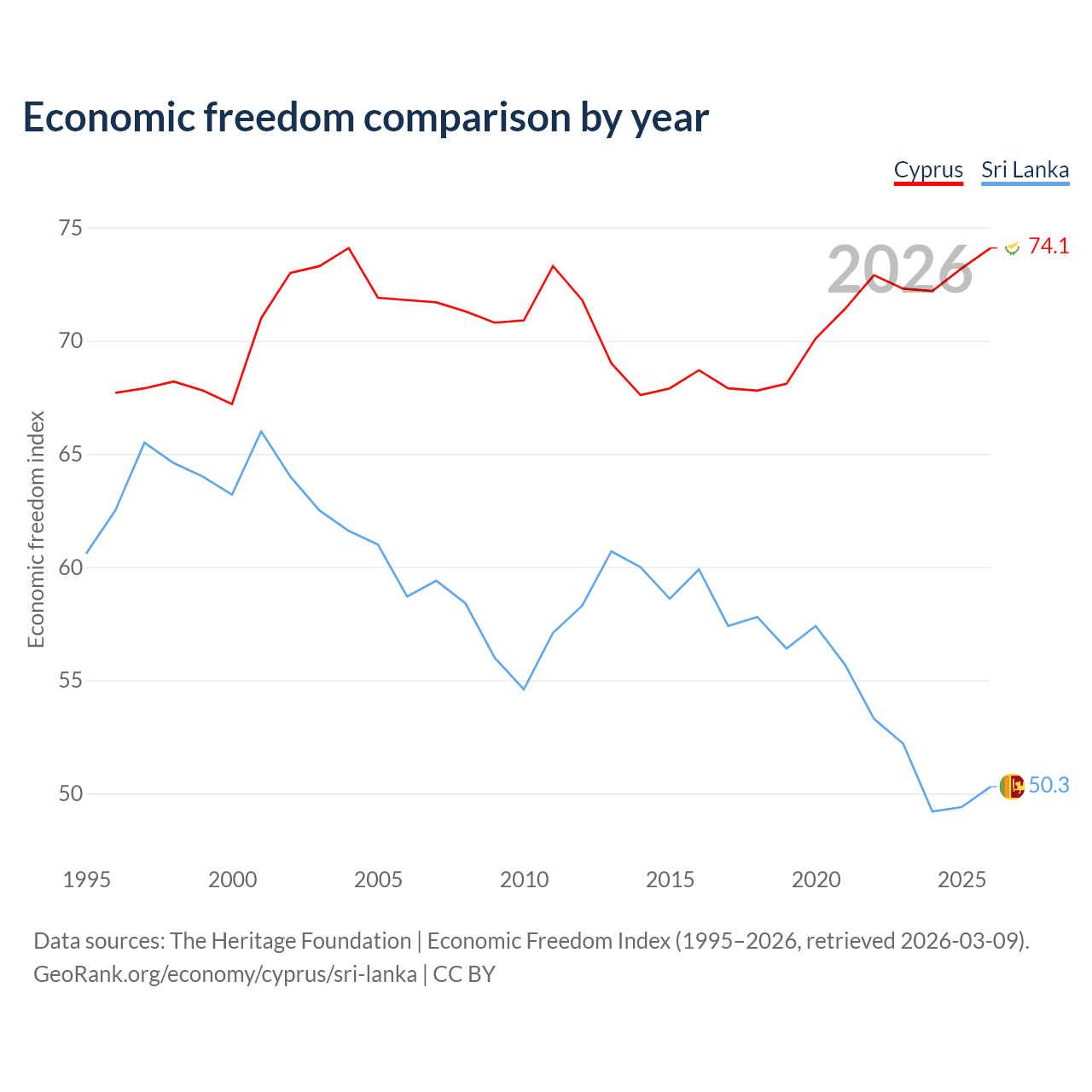 The Economic Freedom Index for Cyprus is 74.1, ranking 21/197, compared to 50.3 for Sri Lanka, ranking 162/197. The chart above displays a comparison of annual changes in economic freedom indexes.