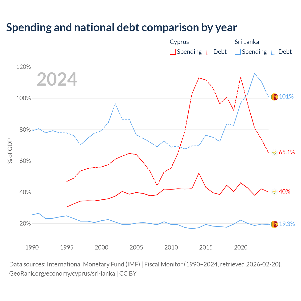 Cyprus has $24.5B in government debt (65.1% of GDP), compared to $99.8B (100.8% of GDP) in Sri Lanka.