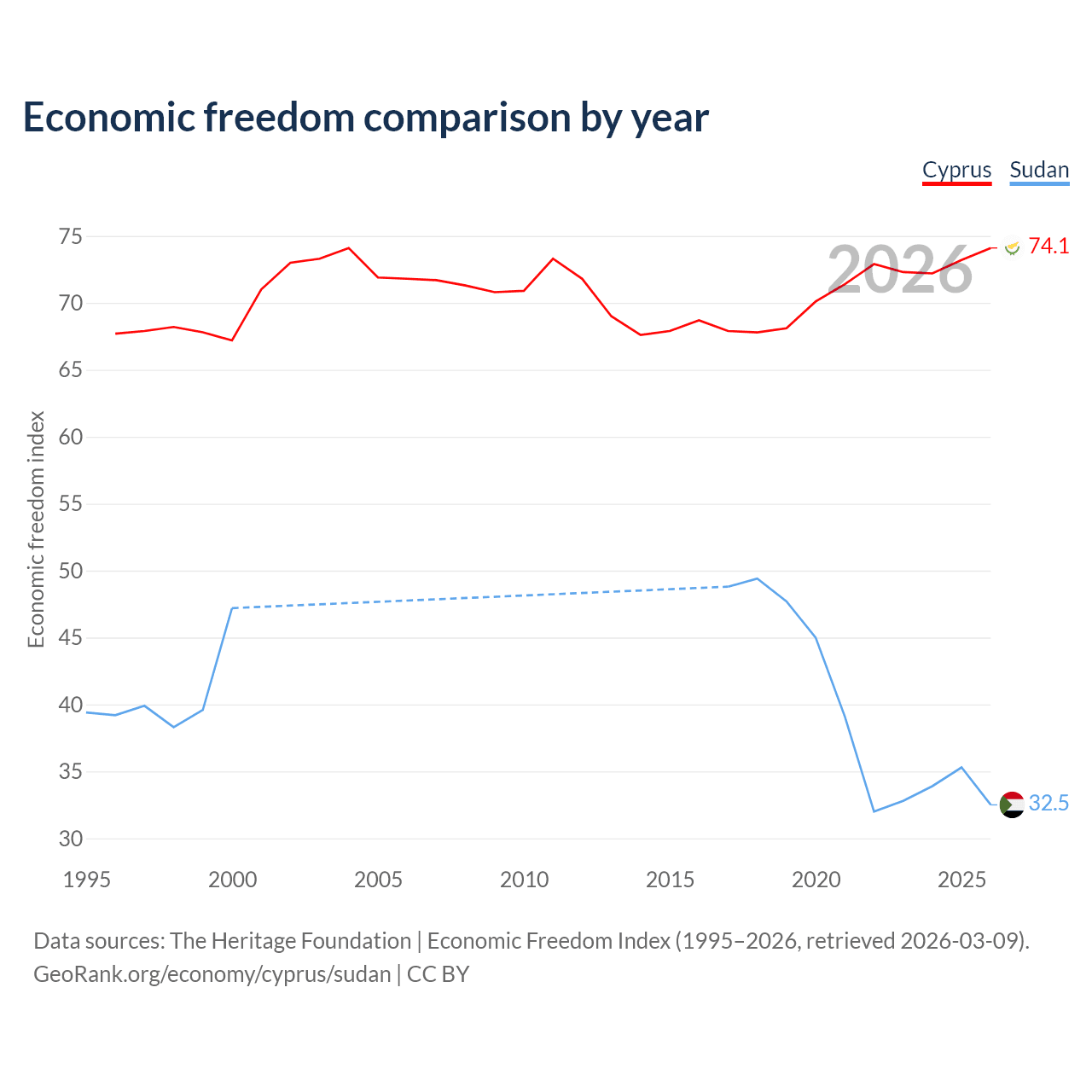 The Economic Freedom Index for Cyprus is 74.1, ranking 21/197, compared to 32.5 for Sudan, ranking 191/197. The chart above displays a comparison of annual changes in economic freedom indexes.