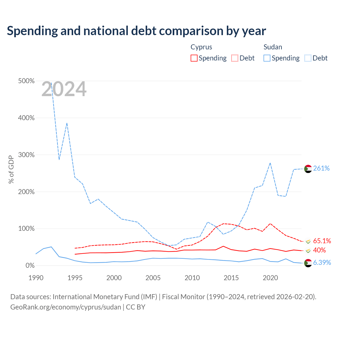 Cyprus has $24.5B in government debt (65.1% of GDP), compared to $130B (261.4% of GDP) in Sudan.