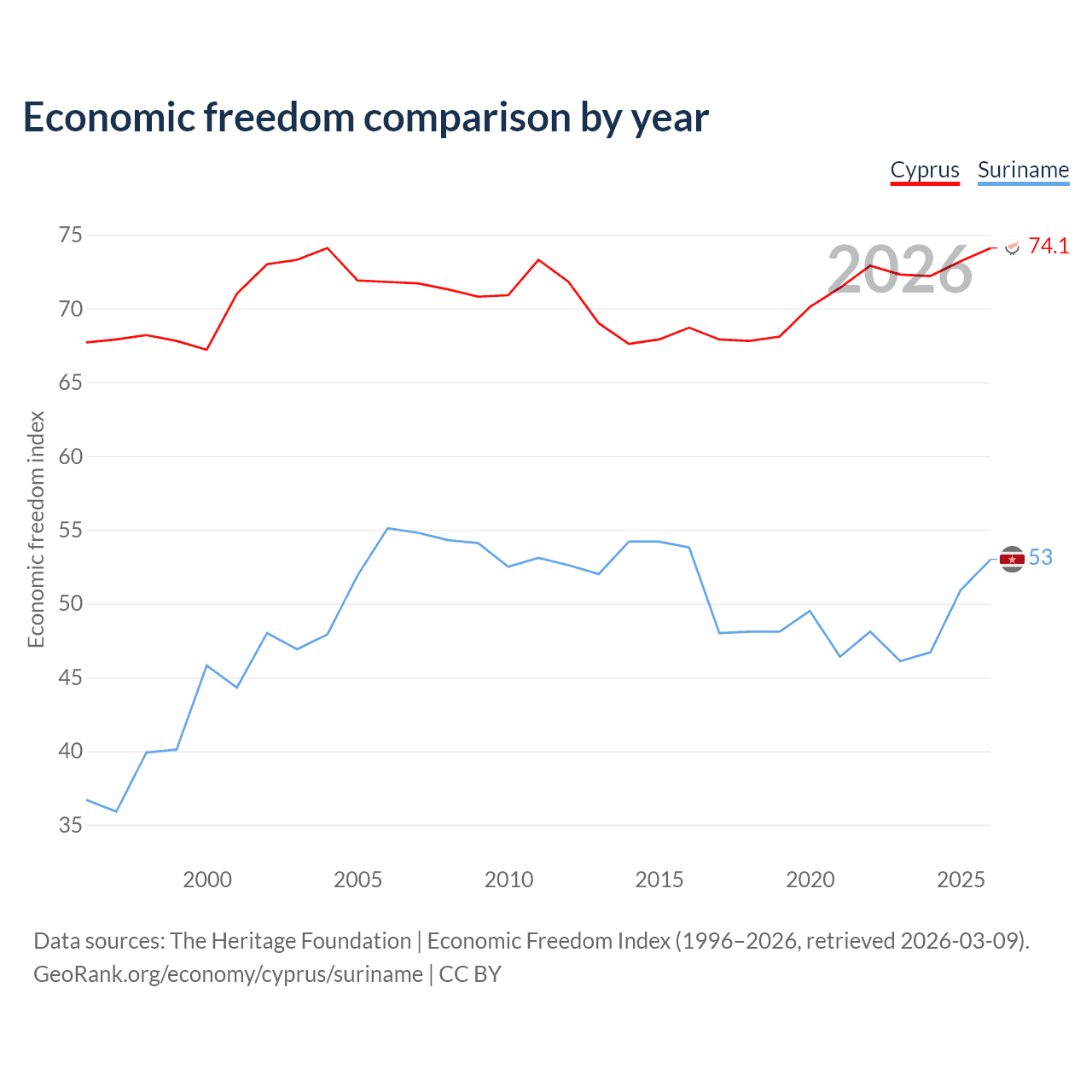 The Economic Freedom Index for Cyprus is 74.1, ranking 21/197, compared to 53 for Suriname, ranking 143/197. The chart above displays a comparison of annual changes in economic freedom indexes.