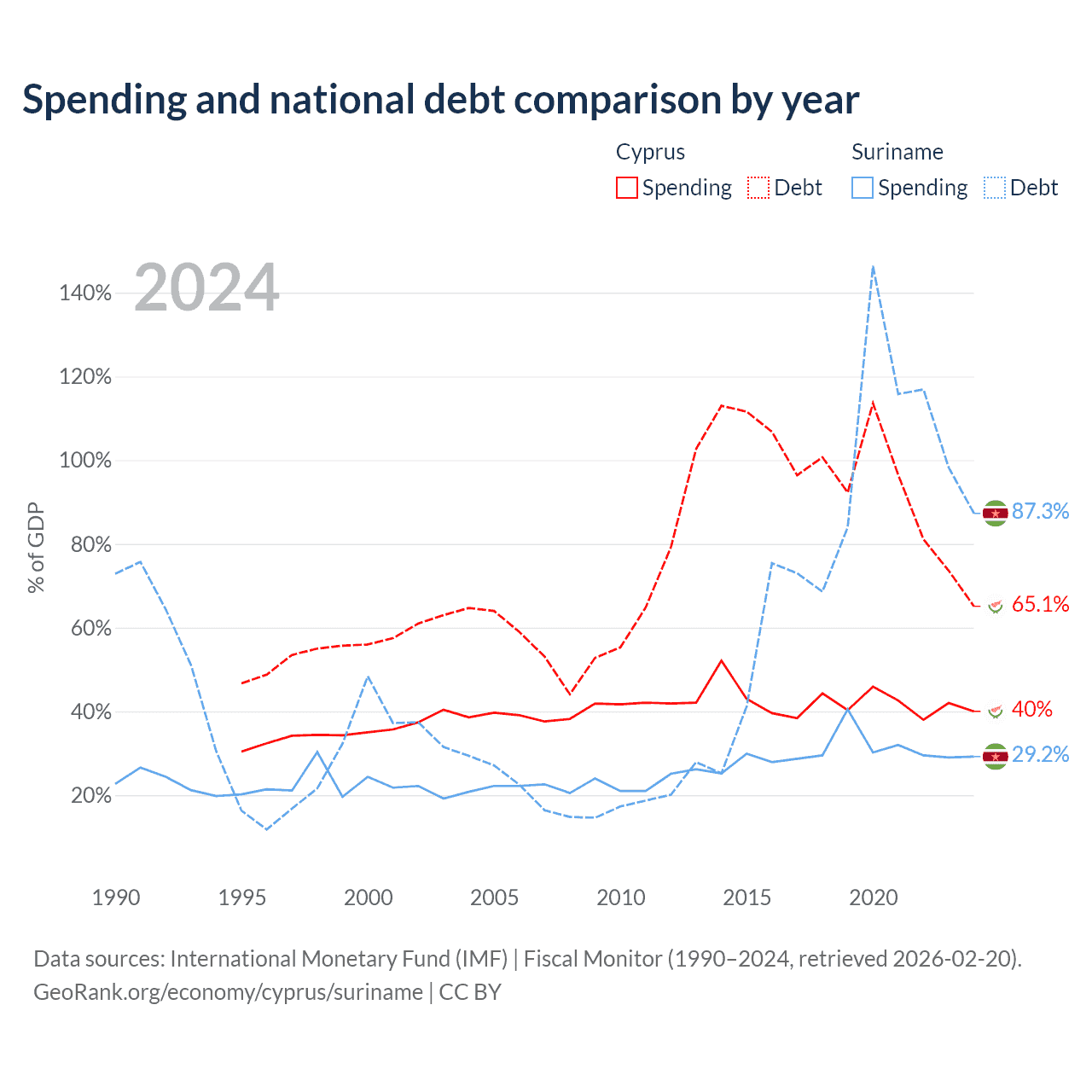 Cyprus has $24.5B in government debt (65.1% of GDP), compared to $3.86B (87.3% of GDP) in Suriname.