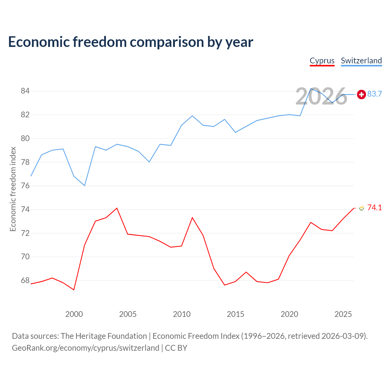 The Economic Freedom Index for Cyprus is 74.1, ranking 21/197, compared to 83.7 for Switzerland, ranking 2/197. The chart above displays a comparison of annual changes in economic freedom indexes.