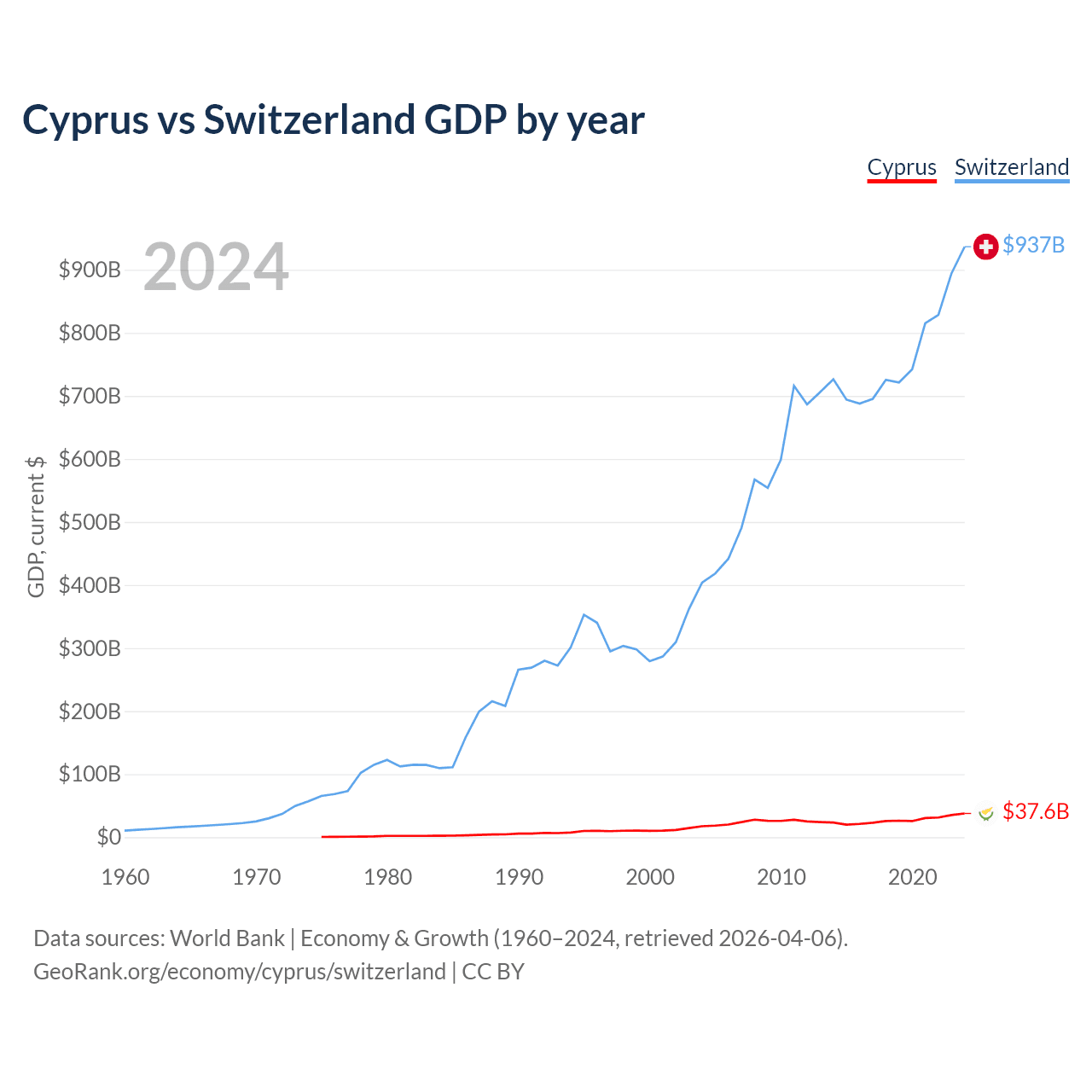 Cyprus has a GDP of $37.6B compared to $937B for Switzerland, ranking 103/197 and 20/197 by economy size, respectively.