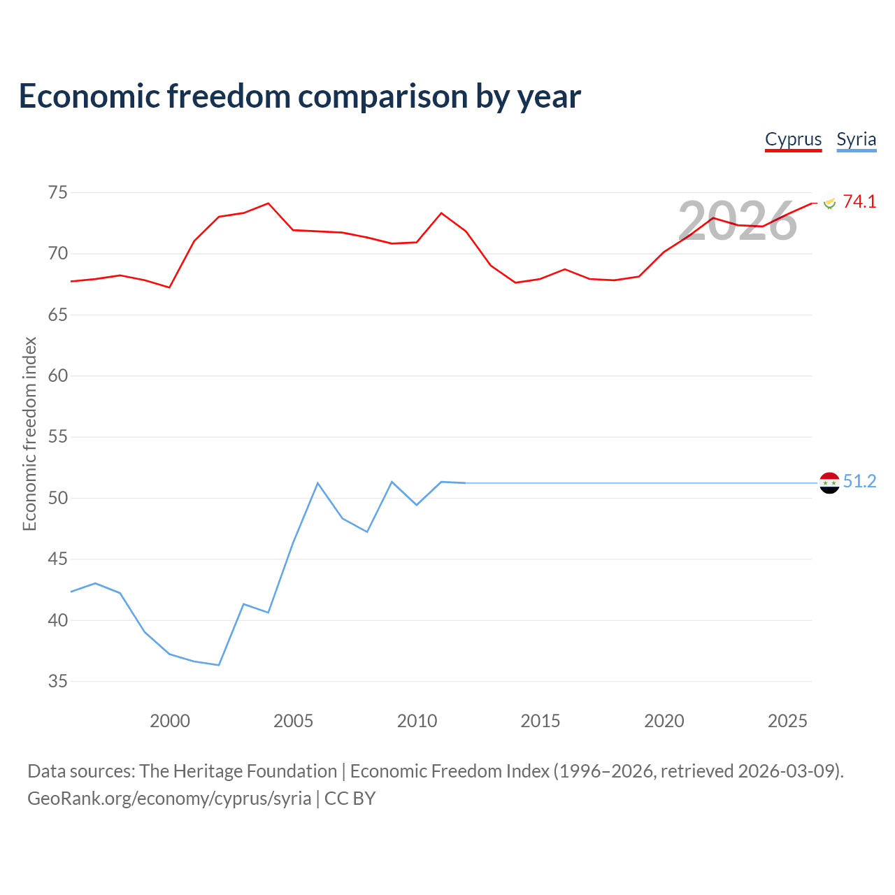 The Economic Freedom Index for Cyprus is 74.1, ranking 21/197, compared to 51.2 for Syria, ranking 155/197. The chart above displays a comparison of annual changes in economic freedom indexes.