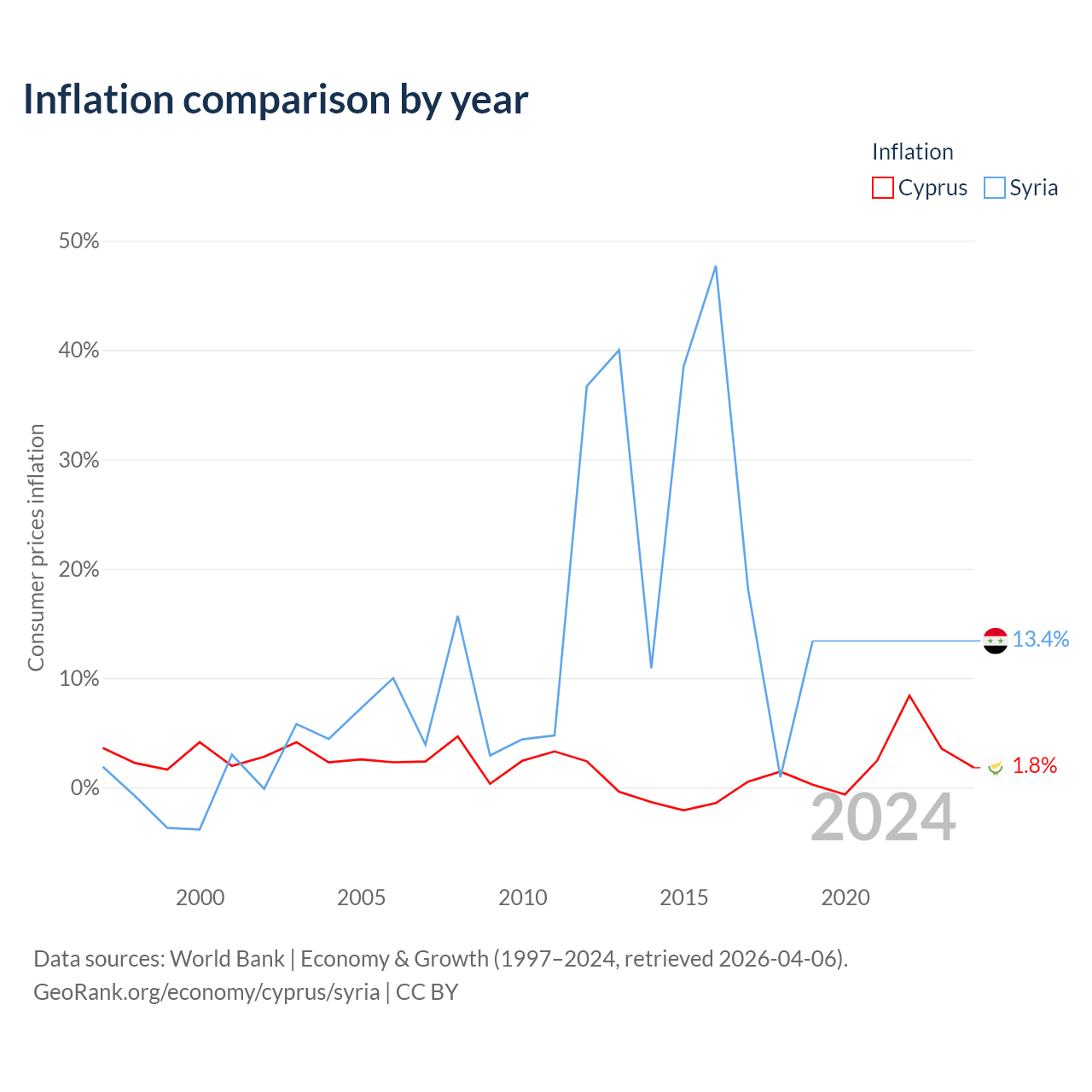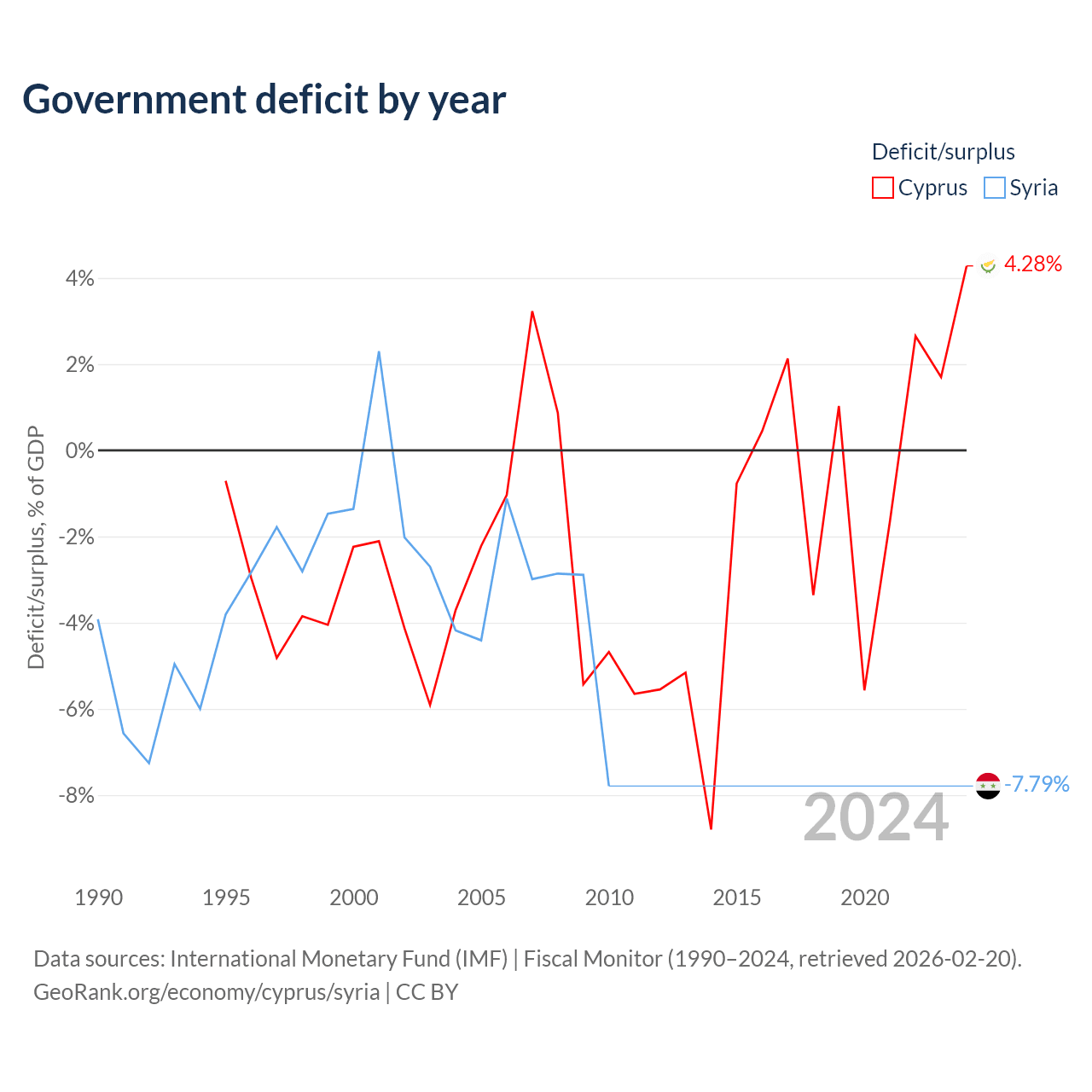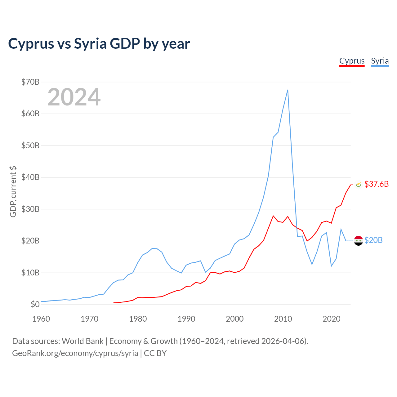 Cyprus has a GDP of $37.6B compared to $20B for Syria, ranking 103/197 and 129/197 by economy size, respectively.