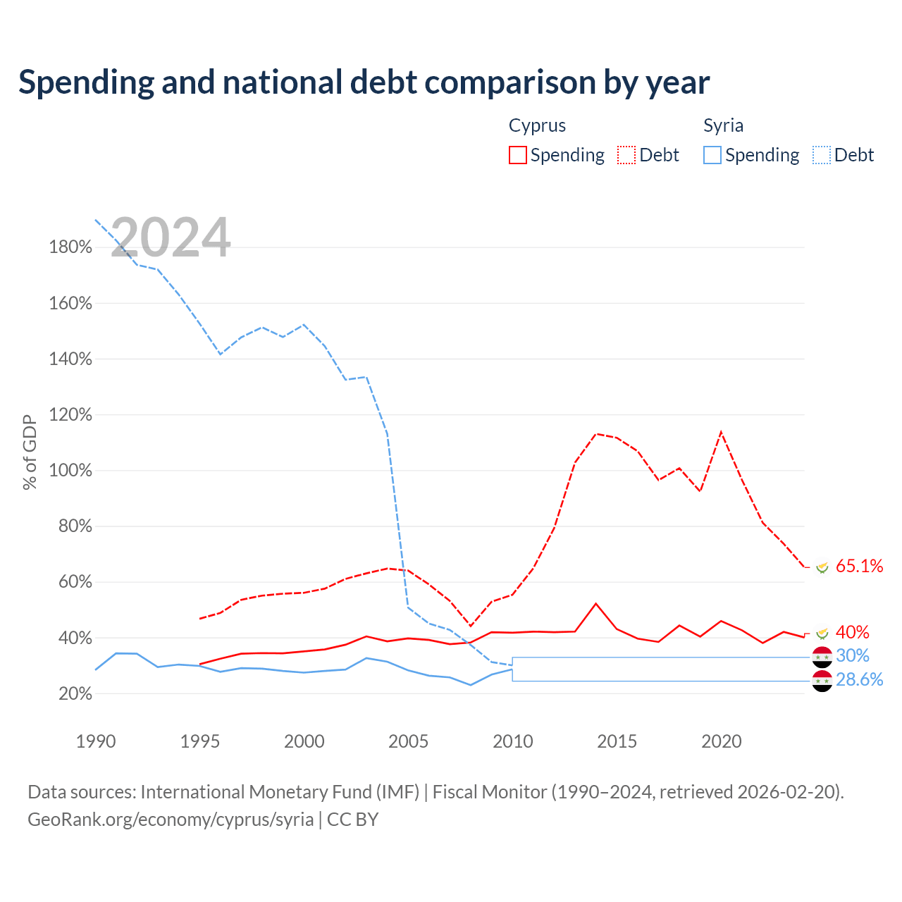 Cyprus has $24.5B in government debt (65.1% of GDP), compared to $18.4B (30% of GDP) in Syria.