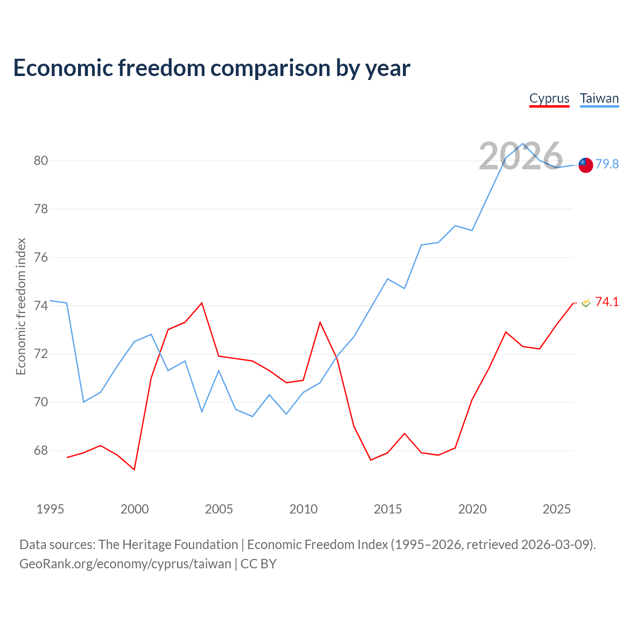 The Economic Freedom Index for Cyprus is 74.1, ranking 21/197, compared to 79.8 for Taiwan, ranking 6/197. The chart above displays a comparison of annual changes in economic freedom indexes.