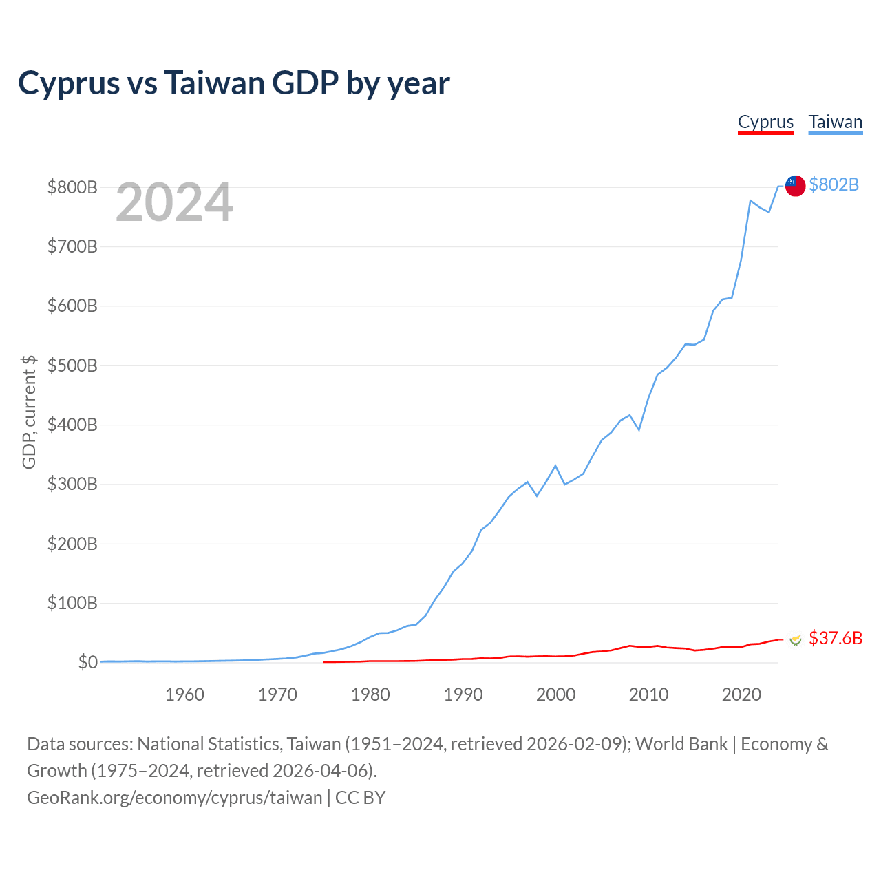 Cyprus has a GDP of $37.6B compared to $802B for Taiwan, ranking 103/197 and 22/197 by economy size, respectively.