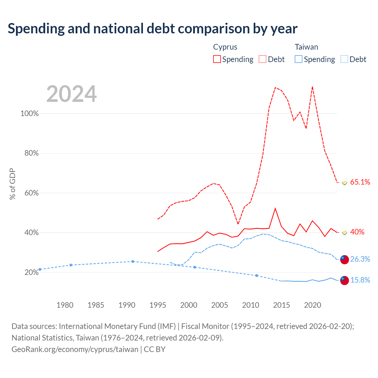 Cyprus has $24.5B in government debt (65.1% of GDP), compared to $211B (26.3% of GDP) in Taiwan.