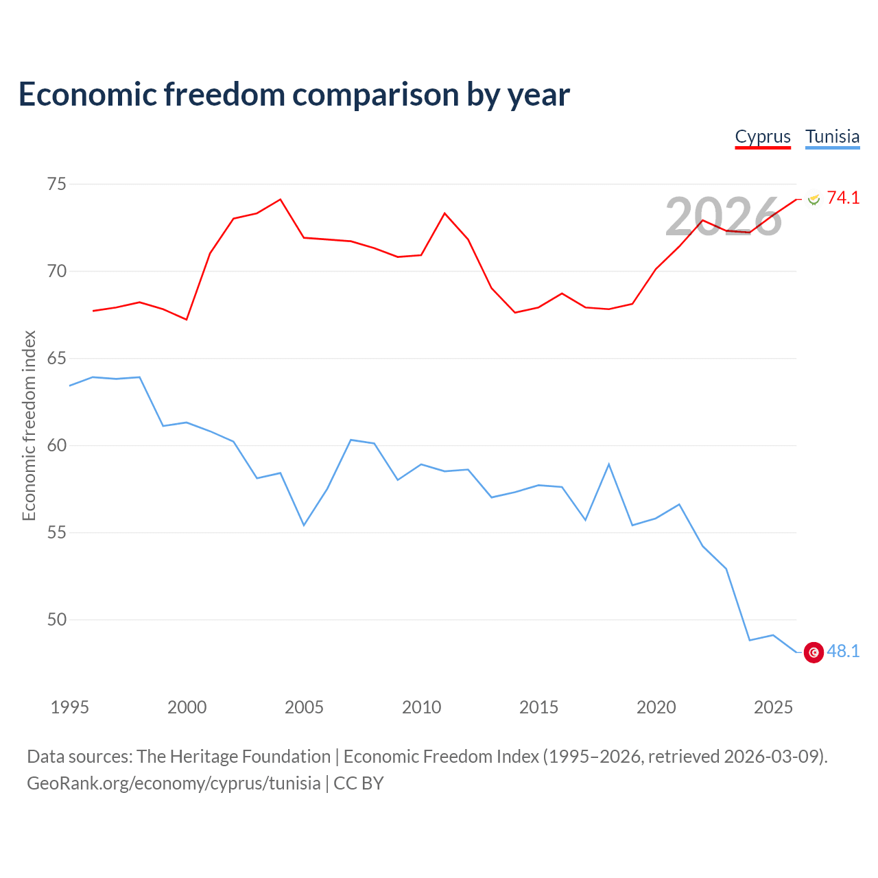 The Economic Freedom Index for Cyprus is 74.1, ranking 21/197, compared to 48.1 for Tunisia, ranking 172/197. The chart above displays a comparison of annual changes in economic freedom indexes.