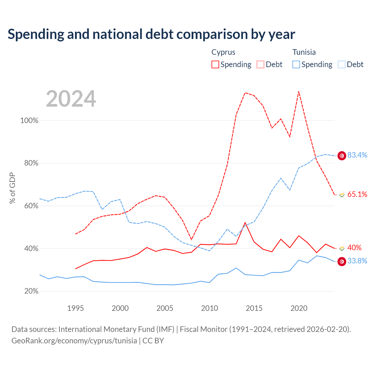 Cyprus has $24.5B in government debt (65.1% of GDP), compared to $42.8B (83.4% of GDP) in Tunisia.