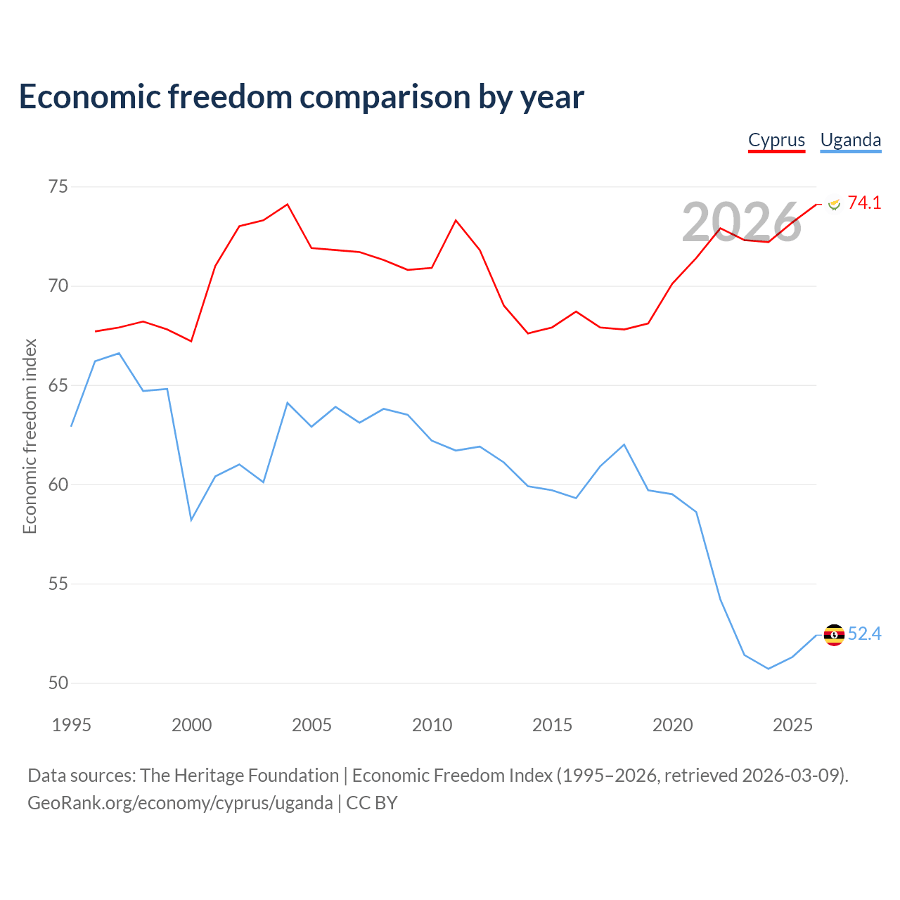 The Economic Freedom Index for Cyprus is 74.1, ranking 21/197, compared to 52.4 for Uganda, ranking 149/197. The chart above displays a comparison of annual changes in economic freedom indexes.