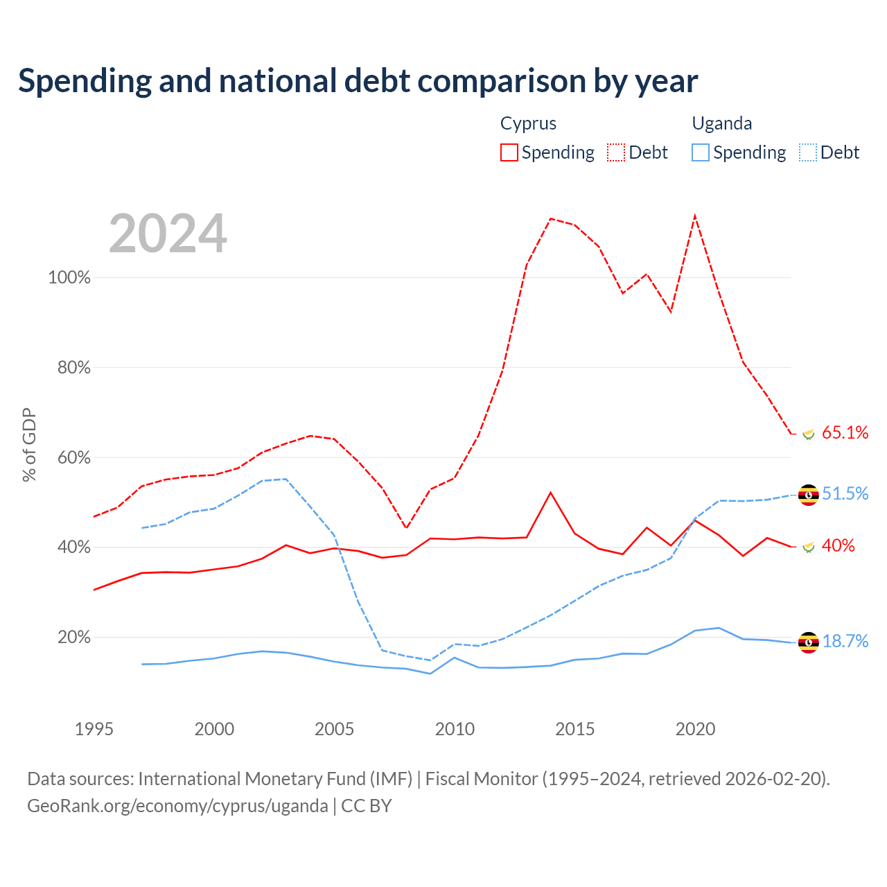 Cyprus has $24.5B in government debt (65.1% of GDP), compared to $27.8B (51.5% of GDP) in Uganda.