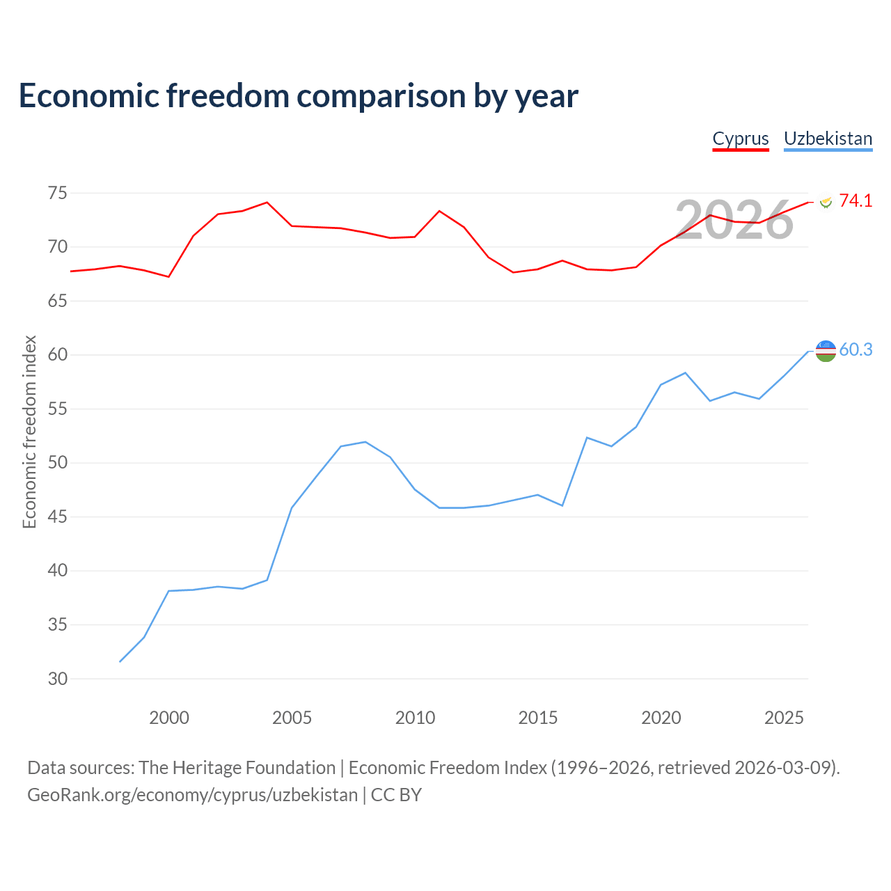 The Economic Freedom Index for Cyprus is 74.1, ranking 21/197, compared to 60.3 for Uzbekistan, ranking 94/197. The chart above displays a comparison of annual changes in economic freedom indexes.