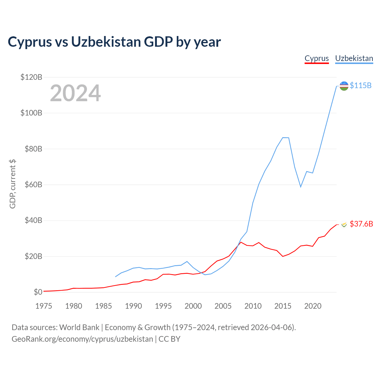 Cyprus has a GDP of $37.6B compared to $115B for Uzbekistan, ranking 103/197 and 66/197 by economy size, respectively.