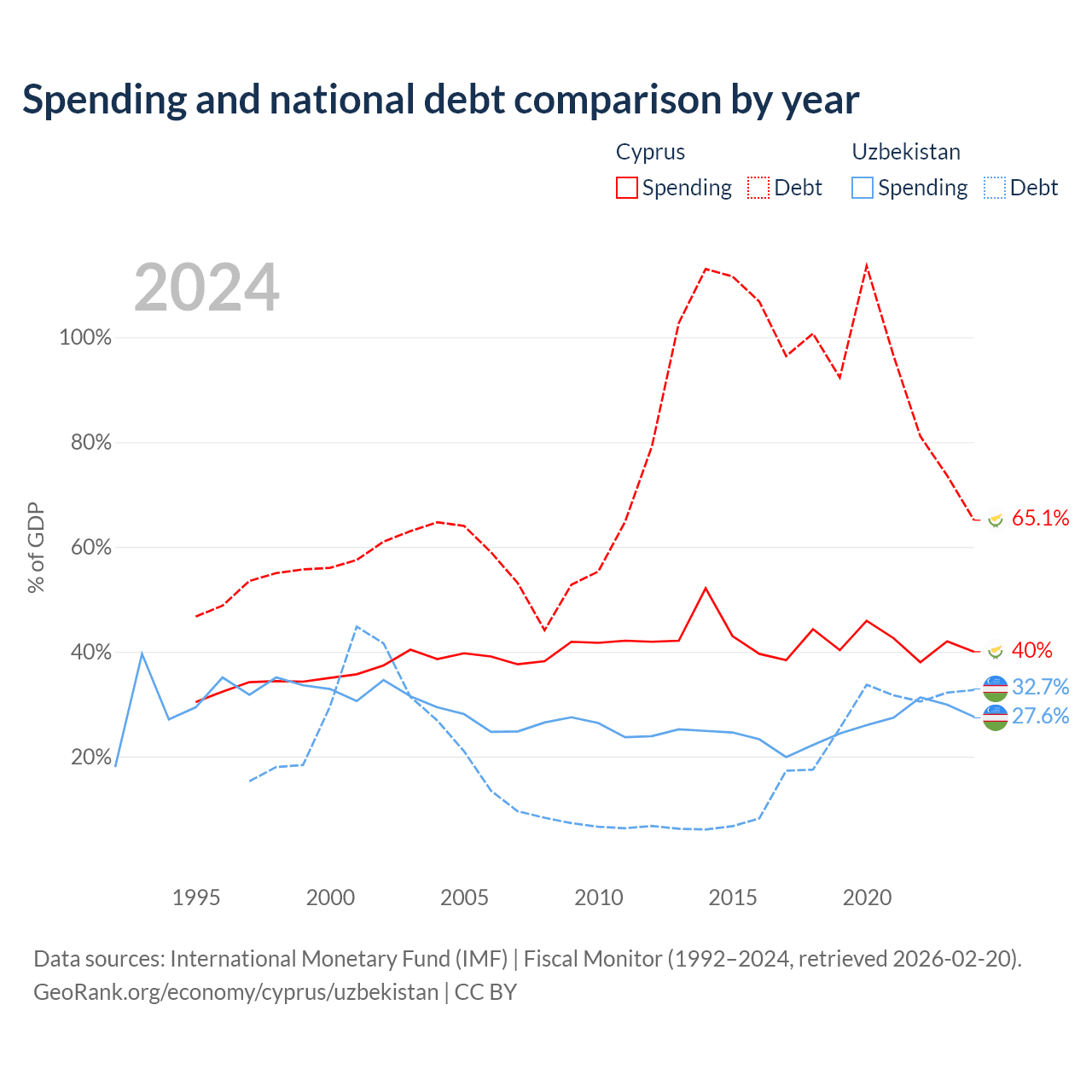 Cyprus has $24.5B in government debt (65.1% of GDP), compared to $37.5B (32.7% of GDP) in Uzbekistan.
