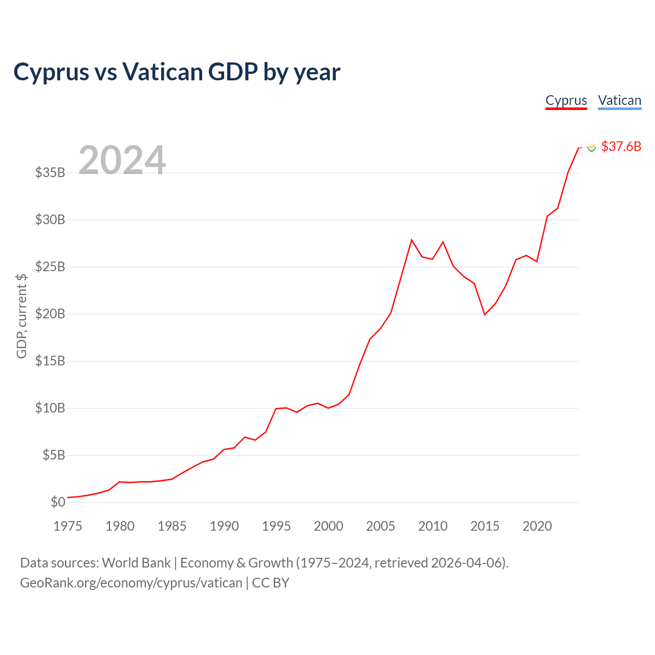 Cyprus has a GDP of $37.6B compared to $19.8M for the Vatican, ranking 103/197 and 197/197 by economy size, respectively.