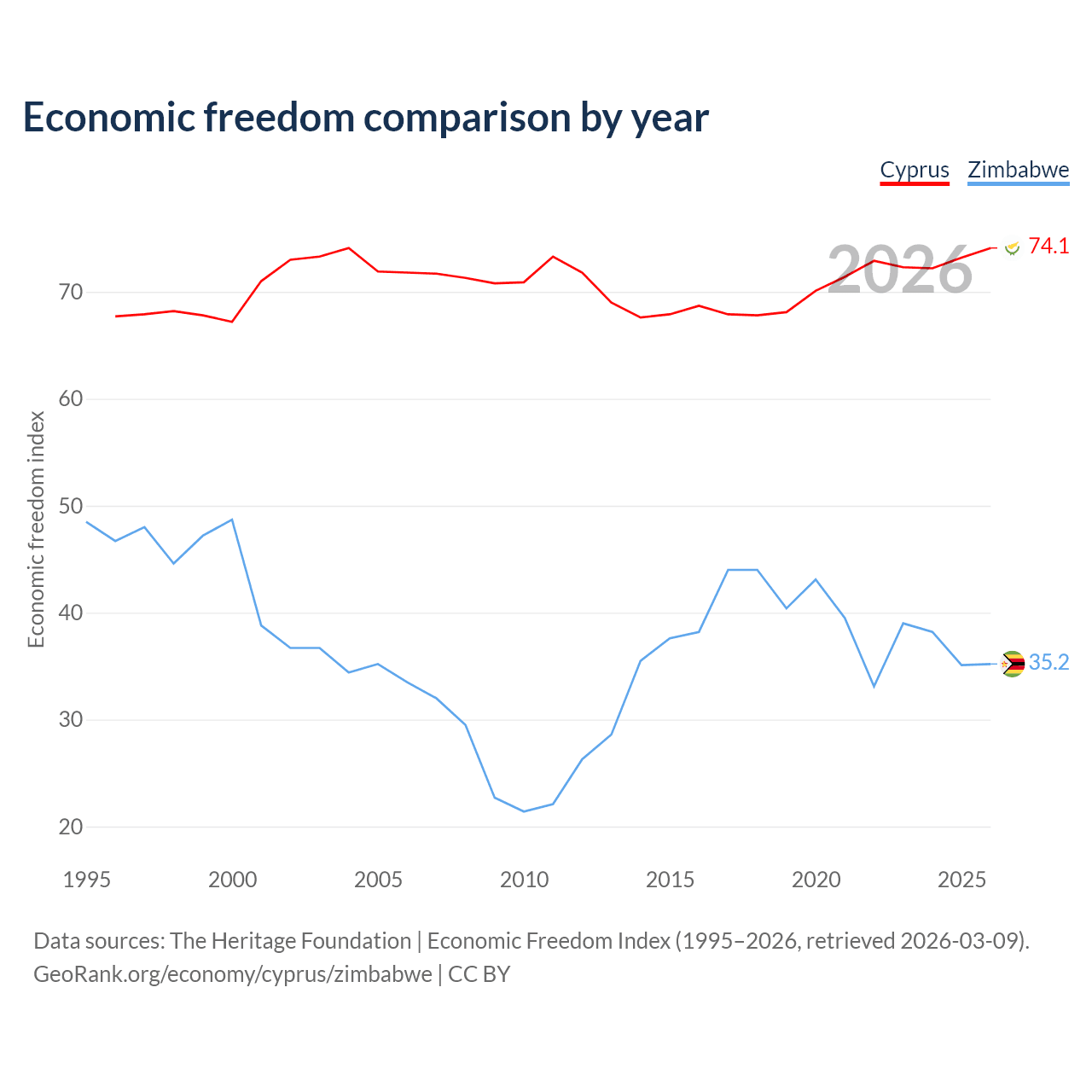 The Economic Freedom Index for Cyprus is 74.1, ranking 21/197, compared to 35.2 for Zimbabwe, ranking 190/197. The chart above displays a comparison of annual changes in economic freedom indexes.