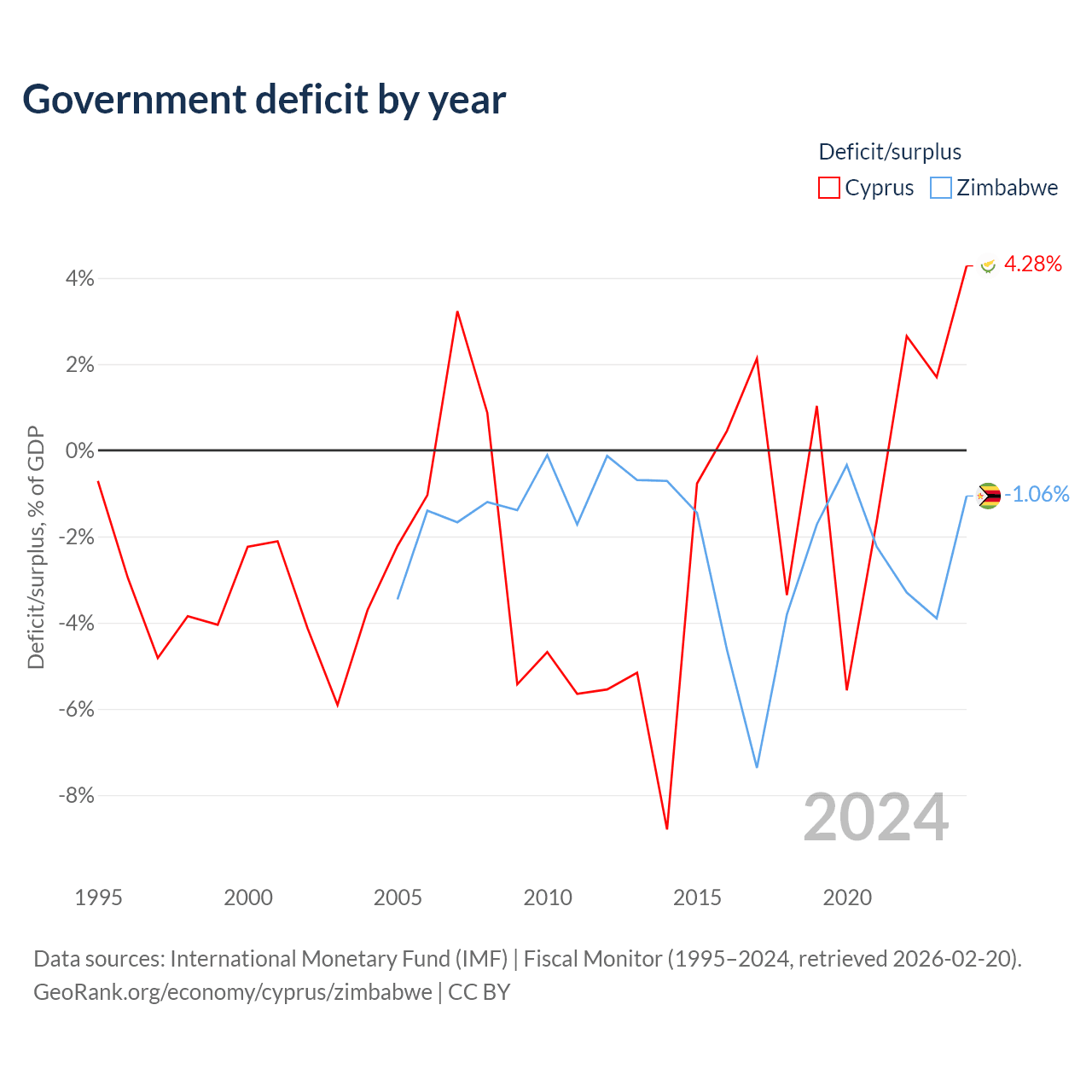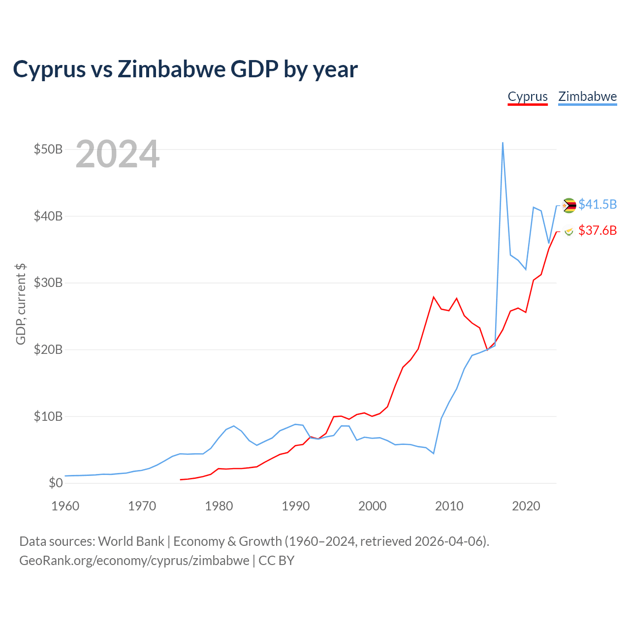 Cyprus has a GDP of $37.6B compared to $41.5B for Zimbabwe, ranking 103/197 and 102/197 by economy size, respectively.