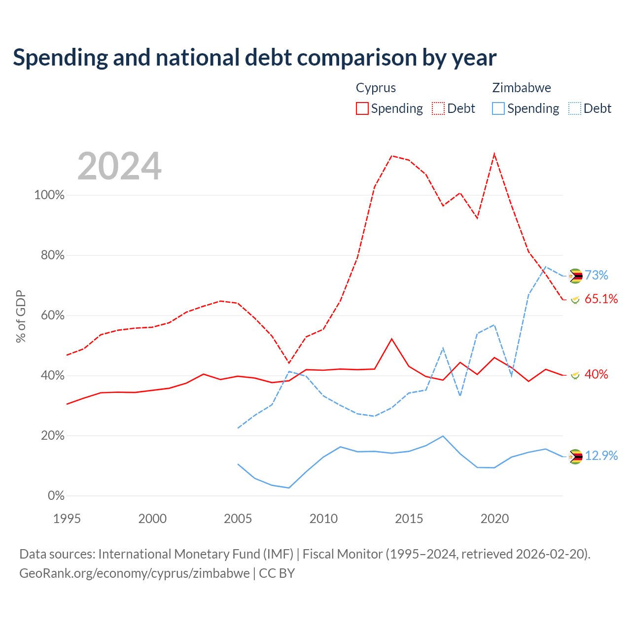 Cyprus has $24.5B in government debt (65.1% of GDP), compared to $30.3B (73% of GDP) in Zimbabwe.