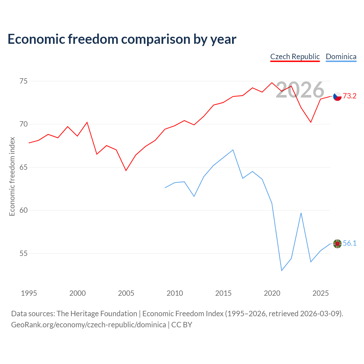 The Economic Freedom Index for the Czech Republic is 73.2, ranking 25/197, compared to 56.1 for Dominica, ranking 124/197. The chart above displays a comparison of annual changes in economic freedom indexes.