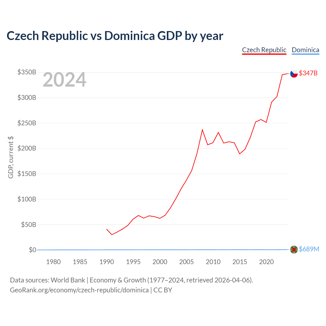 The Czech Republic has a GDP of $347B compared to $689M for Dominica, ranking 44/197 and 190/197 by economy size, respectively.