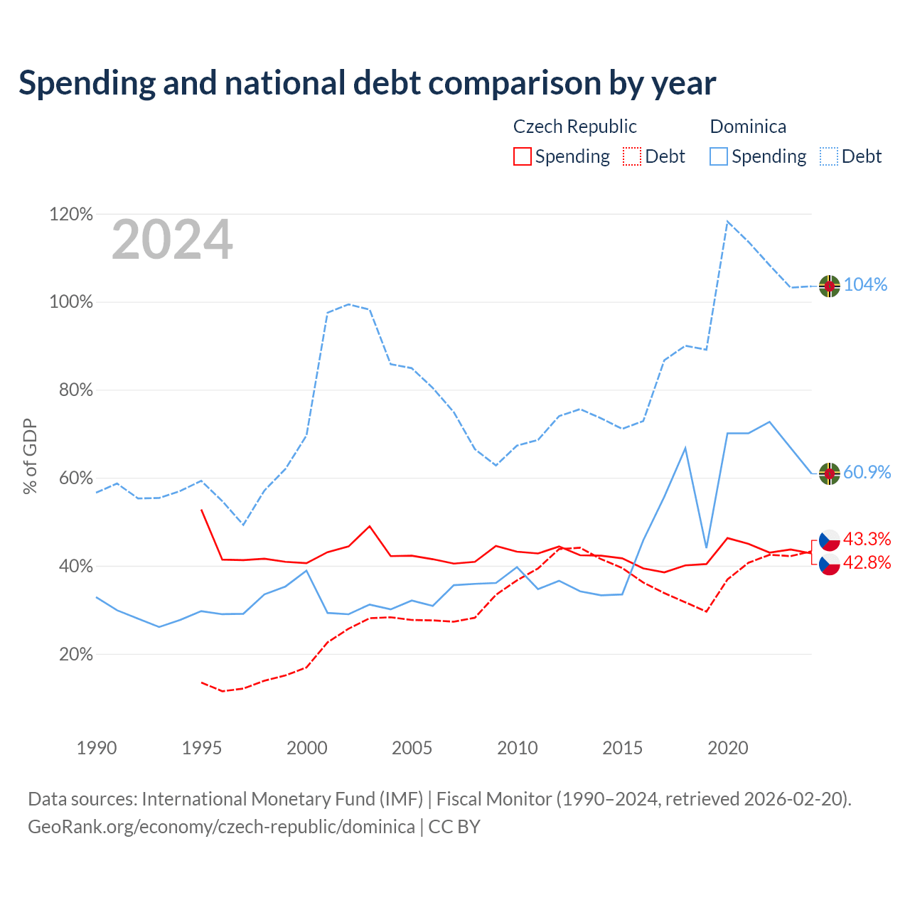 The Czech Republic has $150B in government debt (43.3% of GDP), compared to $713M (103.5% of GDP) in Dominica.