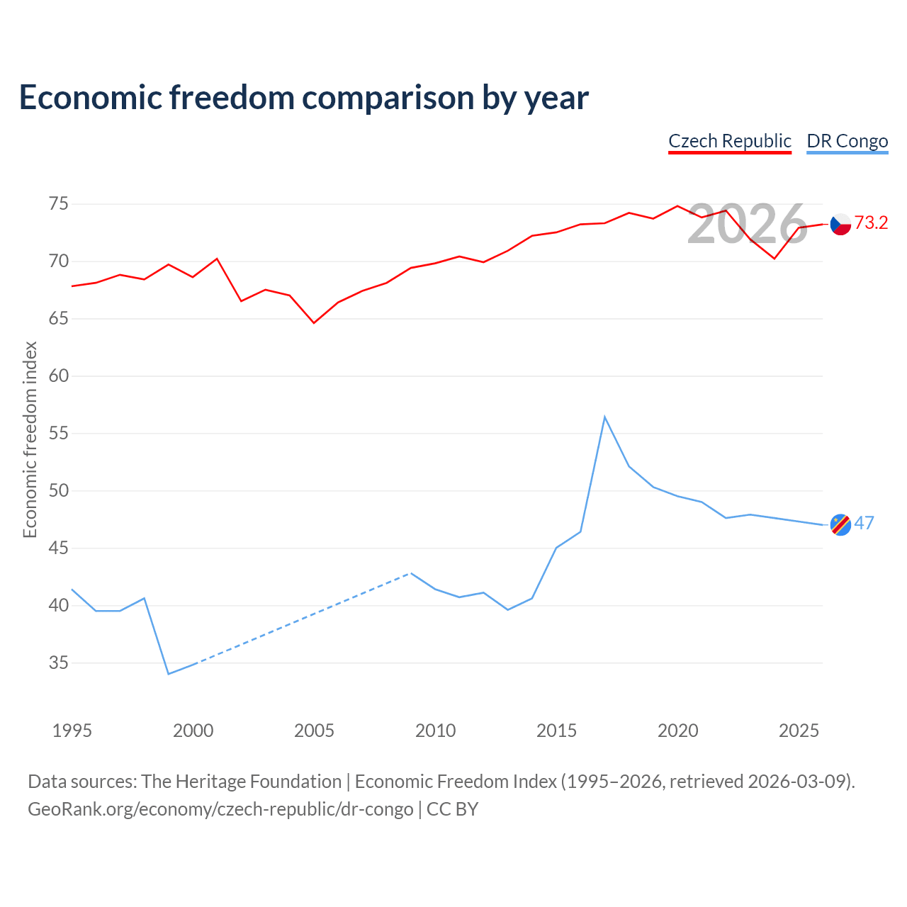 The Economic Freedom Index for the Czech Republic is 73.2, ranking 25/197, compared to 47 for the DR Congo, ranking 176/197. The chart above displays a comparison of annual changes in economic freedom indexes.