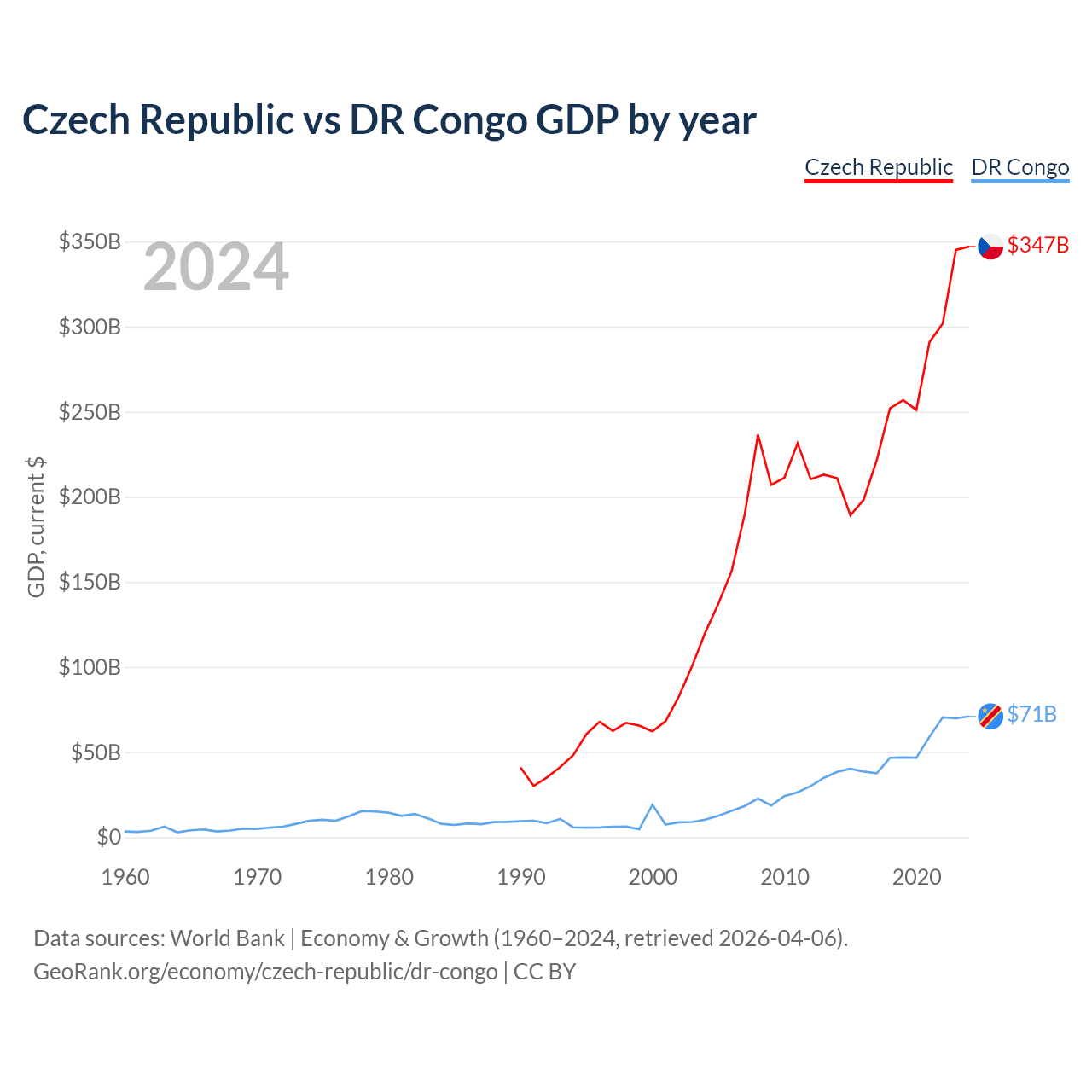 The Czech Republic has a GDP of $347B compared to $71B for the DR Congo, ranking 44/197 and 87/197 by economy size, respectively.
