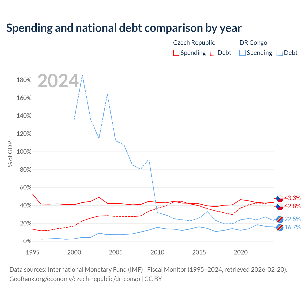 The Czech Republic has $150B in government debt (43.3% of GDP), compared to $16B (22.5% of GDP) in the DR Congo.